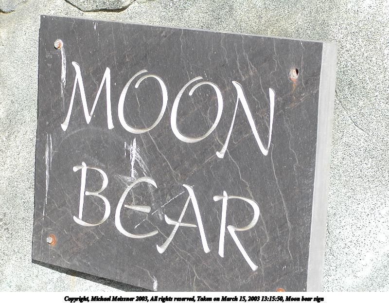 Picture #21: Moon bear sign 800x623, 143,641 bytes (141K), (html file) Copyright, Michael Meissner 2003, All rights reserved Olympus C-2100UZ camera f/4.5, ISO 100, 1/320 sec, 22.3mm, auto mode, SHQ, matrix metering 35mm equivalent focal length 124.0mm Taken by Michael Meissner on March 15, 2003 13:15:50 Last modified on March 28, 2003 at 09:10 |