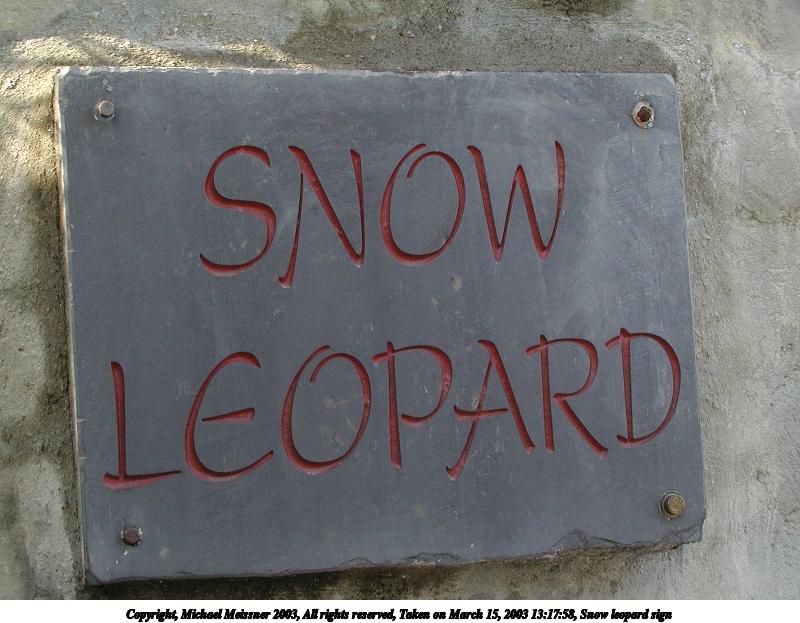 Picture #18: Snow leopard sign 800x623, 84,051 bytes (83K), (html file) Copyright, Michael Meissner 2003, All rights reserved Olympus C-2100UZ camera f/5.6, ISO 100, 1/30 sec, 12.0mm, aperture priority, SHQ, matrix metering 35mm equivalent focal length 67.0mm Taken by Michael Meissner on March 15, 2003 13:17:58 Last modified on March 28, 2003 at 09:10 |