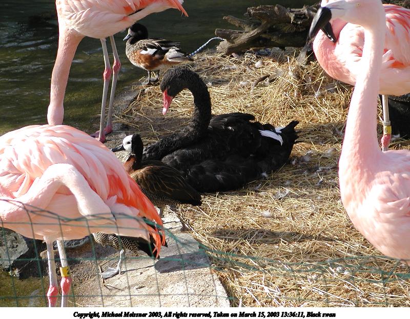 Picture #10: Black swan #2 800x623, 139,669 bytes (137K), (html file) Copyright, Michael Meissner 2003, All rights reserved Olympus C-2100UZ camera f/2.8, ISO 100, 1/250 sec, 48.3mm, auto mode, SHQ, matrix metering, bias 0.3 35mm equivalent focal length 268.0mm Taken by Michael Meissner on March 15, 2003 13:36:33 Last modified on March 28, 2003 at 09:10 Shutter speed of 1/125 or 1/250 may indicate use of flash |