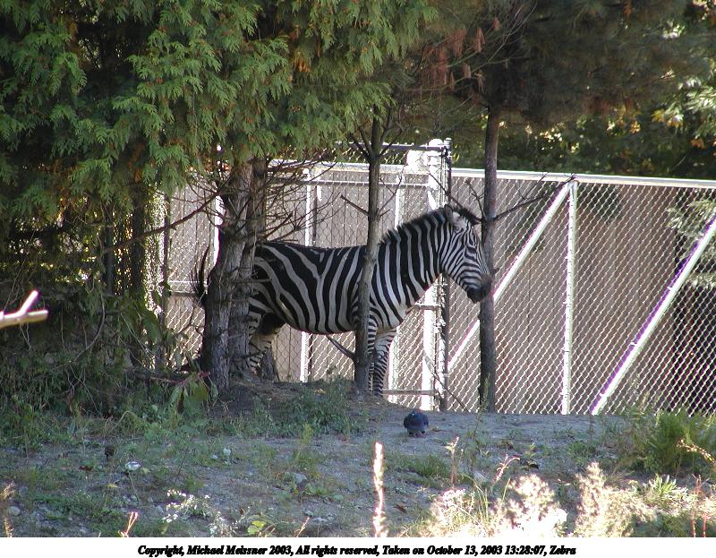Picture #1: Zebra 800x623, 152,423 bytes (149K), (html file) Copyright, Michael Meissner 2003, All rights reserved Olympus C-2100UZ camera f/3.2, ISO 100, 1/125 sec, 57.3mm, auto mode, SHQ, matrix metering 35mm equivalent focal length 318.0mm Taken by Michael Meissner on October 13, 2003 13:28:07 Last modified on October 20, 2003 at 12:19 Shutter speed of 1/125 or 1/250 may indicate use of flash |