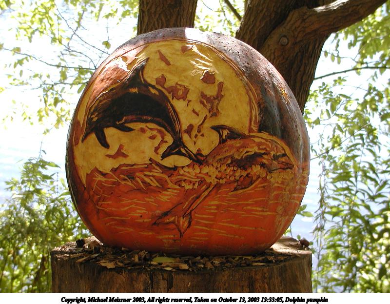 Picture #7: Dolphin pumpkin 800x623, 114,116 bytes (112K), (html file) Copyright, Michael Meissner 2003, All rights reserved Olympus C-2100UZ camera f/2.8, ISO 100, 1/250 sec, 14.7mm, auto mode, SHQ, matrix metering 35mm equivalent focal length 82.0mm Taken by Michael Meissner on October 13, 2003 13:33:05 Last modified on October 20, 2003 at 12:22 Shutter speed of 1/125 or 1/250 may indicate use of flash |
