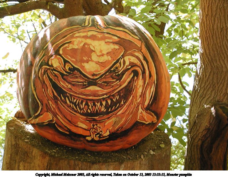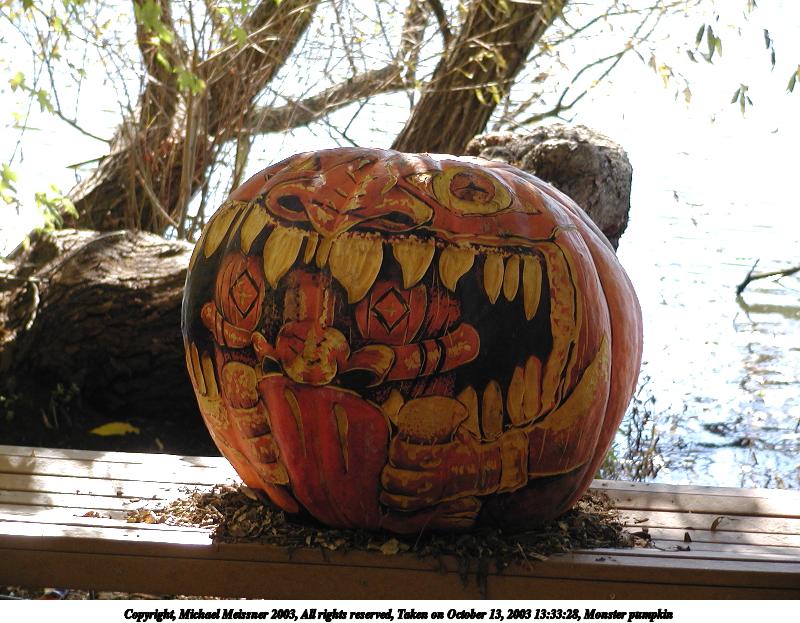 Picture #9: Monster pumpkin #2 800x623, 104,508 bytes (103K), (html file) Copyright, Michael Meissner 2003, All rights reserved Olympus C-2100UZ camera f/2.8, ISO 100, 1/200 sec, 24.2mm, auto mode, SHQ, matrix metering 35mm equivalent focal length 134.0mm Taken by Michael Meissner on October 13, 2003 13:33:28 Last modified on October 20, 2003 at 12:23 |