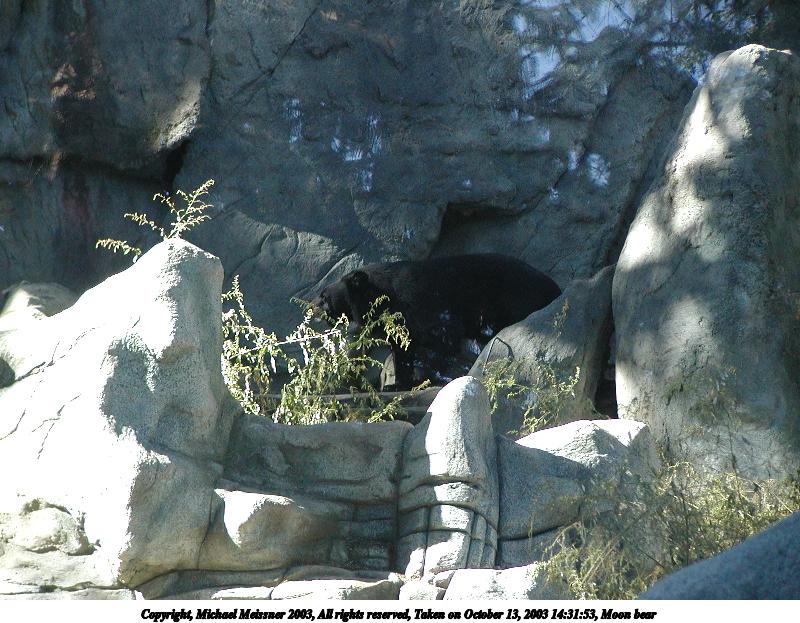 Picture #3: Moon bear #3 800x623, 111,248 bytes (109K), (html file) Copyright, Michael Meissner 2003, All rights reserved Olympus C-2100UZ camera f/2.8, ISO 200, 1/250 sec, 31.1mm, auto mode, SHQ, matrix metering 35mm equivalent focal length 173.0mm Taken by Michael Meissner on October 13, 2003 14:31:53 Last modified on October 20, 2003 at 12:43 Shutter speed of 1/125 or 1/250 may indicate use of flash |