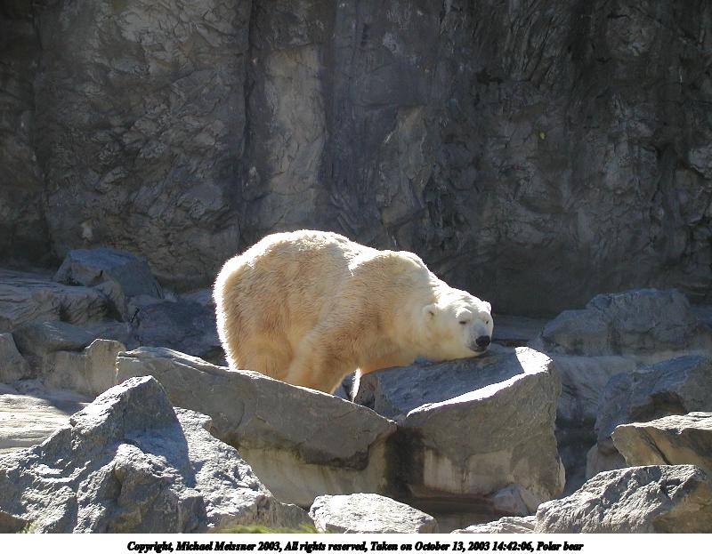 Picture #4: Polar bear 800x623, 89,524 bytes (88K), (html file) Copyright, Michael Meissner 2003, All rights reserved Olympus C-2100UZ camera f/3.2, ISO 100, 1/650 sec, 18.6mm, auto mode, SHQ, matrix metering 35mm equivalent focal length 103.0mm Taken by Michael Meissner on October 13, 2003 14:42:06 Last modified on October 20, 2003 at 12:44 |