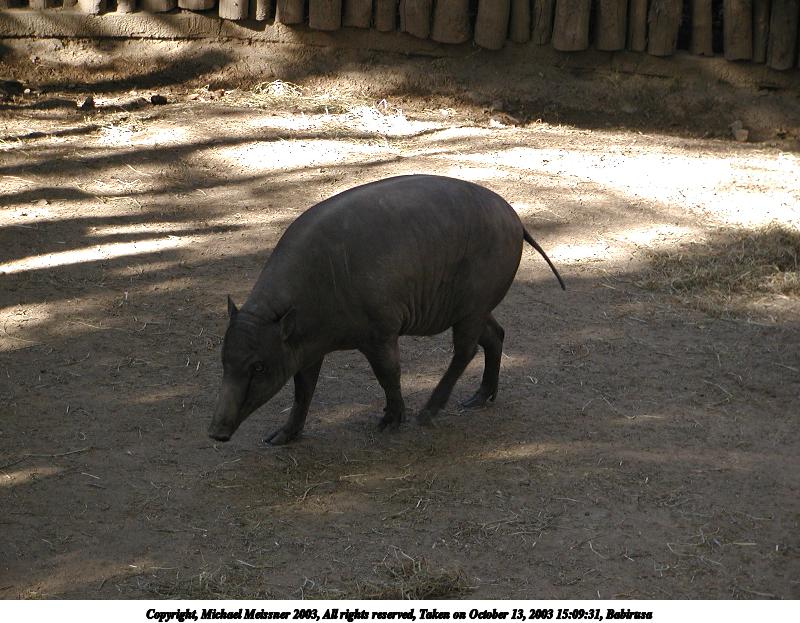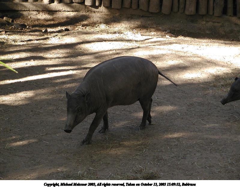 Picture #2: Babirusa #2 800x623, 104,476 bytes (103K), (html file) Copyright, Michael Meissner 2003, All rights reserved Olympus C-2100UZ camera f/2.8, ISO 100, 1/125 sec, 24.2mm, auto mode, SHQ, matrix metering 35mm equivalent focal length 134.0mm Taken by Michael Meissner on October 13, 2003 15:09:32 Last modified on October 21, 2003 at 08:55 Shutter speed of 1/125 or 1/250 may indicate use of flash |