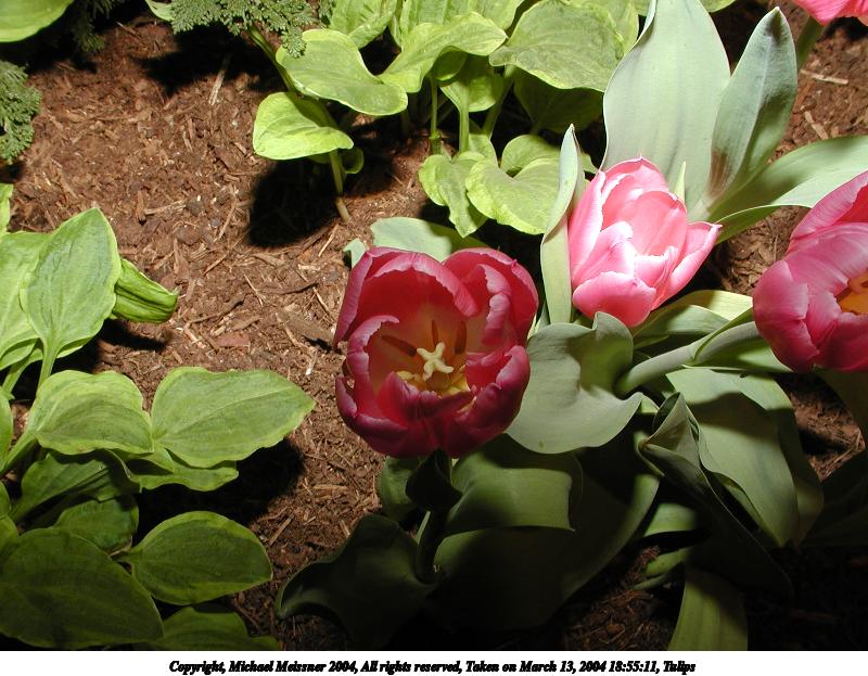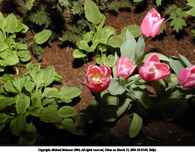 Picture #5: Tulips #3 800x623, 100,690 bytes (99K), (html file) Copyright, Michael Meissner 2004, All rights reserved Olympus C-2100UZ camera f/8.0, ISO 100, 1/125 sec, 9.9mm, shutter priority, SHQ, cloudy, matrix metering, macro 35mm equivalent focal length 55.0mm Taken by Michael Meissner on March 13, 2004 18:55:11 Last modified on March 28, 2004 at 20:42 Shutter speed of 1/125 or 1/250 may indicate use of flash |
