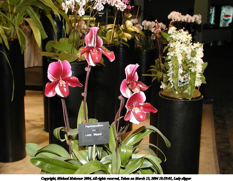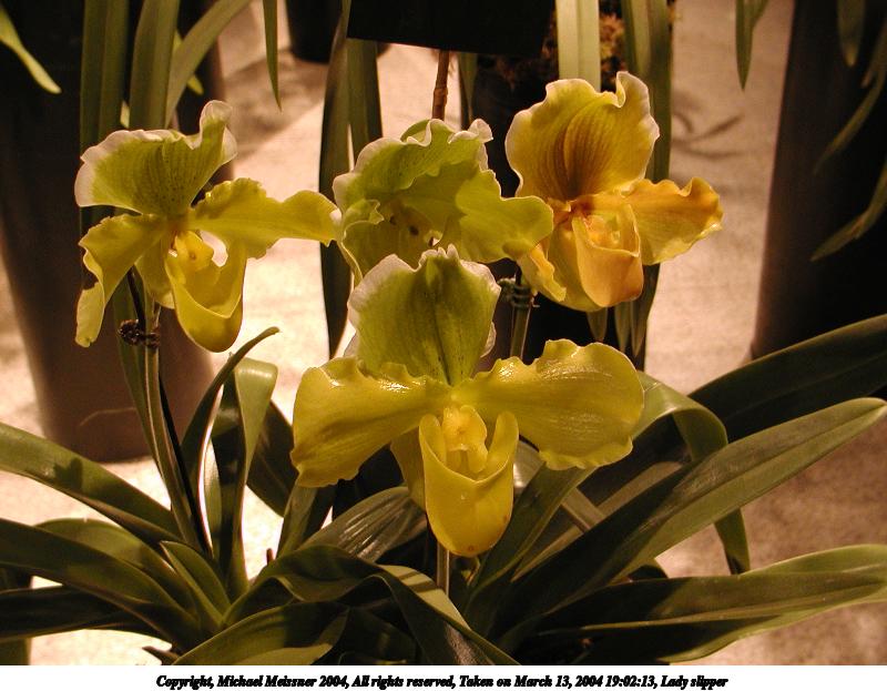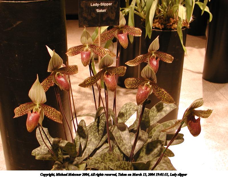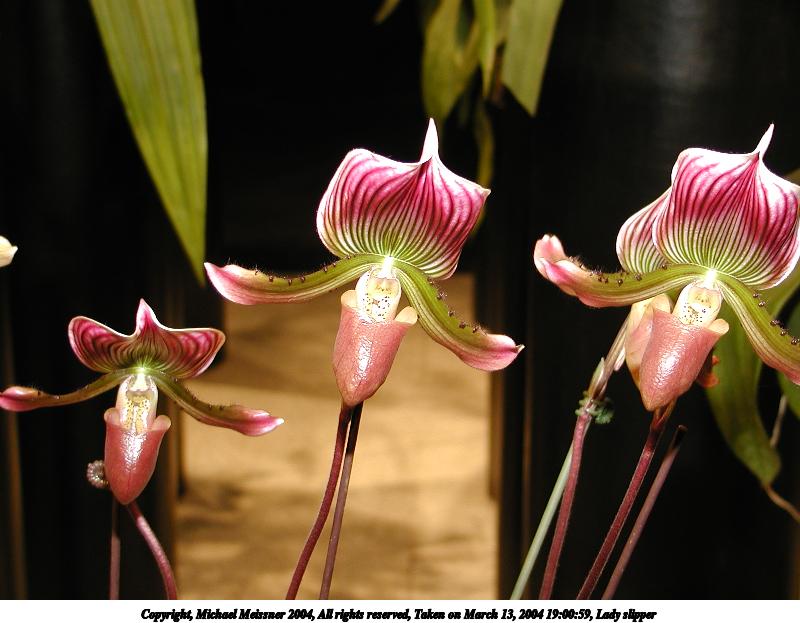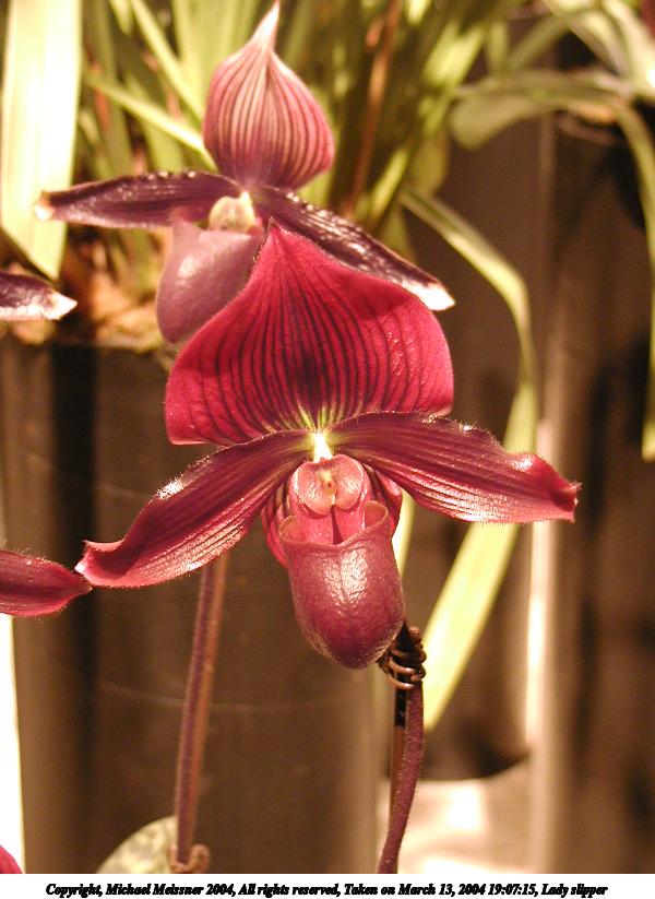Picture #12: Lady slipper #3 800x623, 67,738 bytes (67K), (html file) Copyright, Michael Meissner 2004, All rights reserved Olympus C-2100UZ camera f/2.8, ISO 100, 1/125 sec, 14.3mm, shutter priority, SHQ, cloudy, matrix metering 35mm equivalent focal length 79.0mm Taken by Michael Meissner on March 13, 2004 19:00:59 Last modified on March 28, 2004 at 20:46 Shutter speed of 1/125 or 1/250 may indicate use of flash |