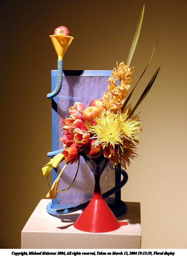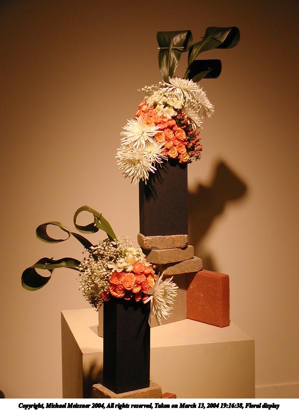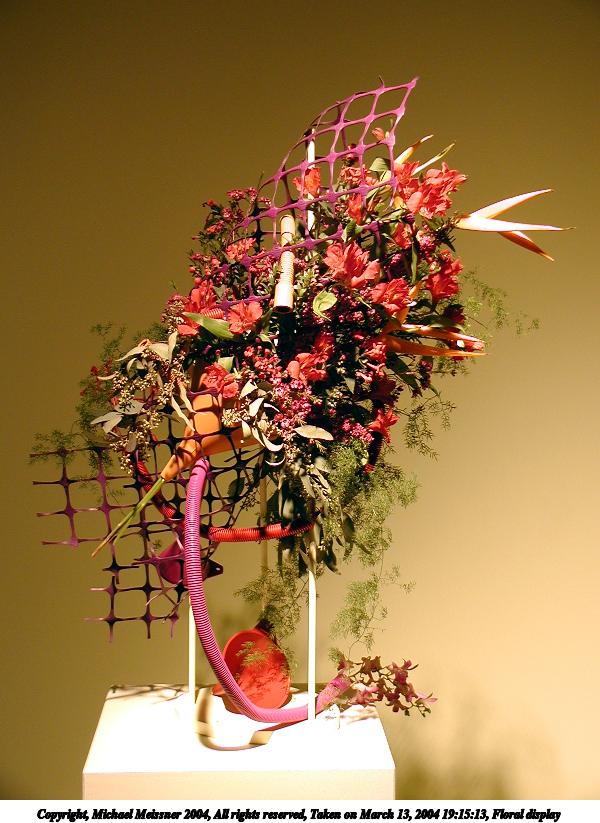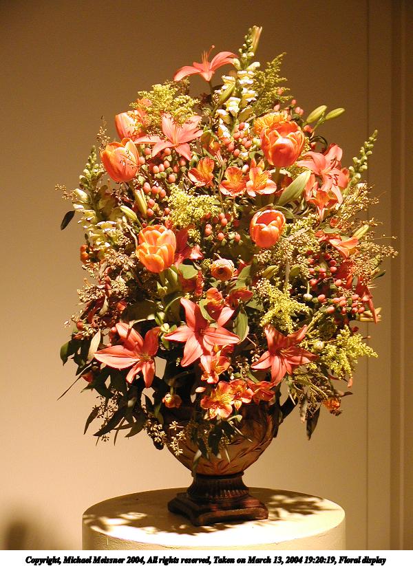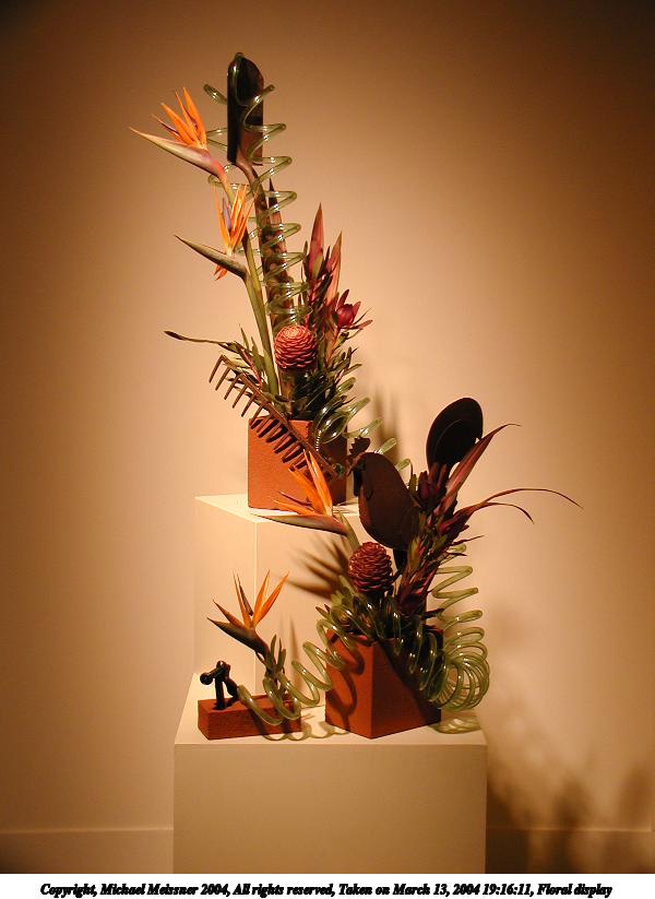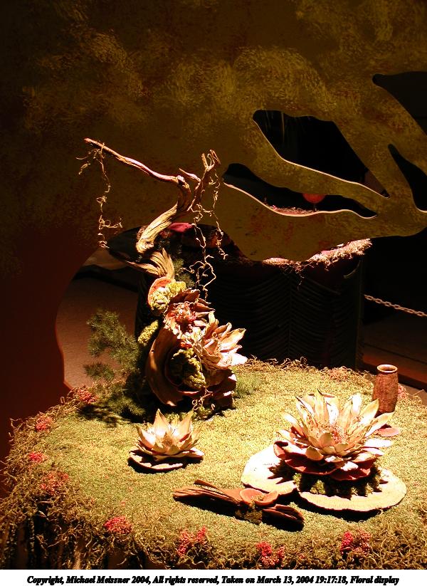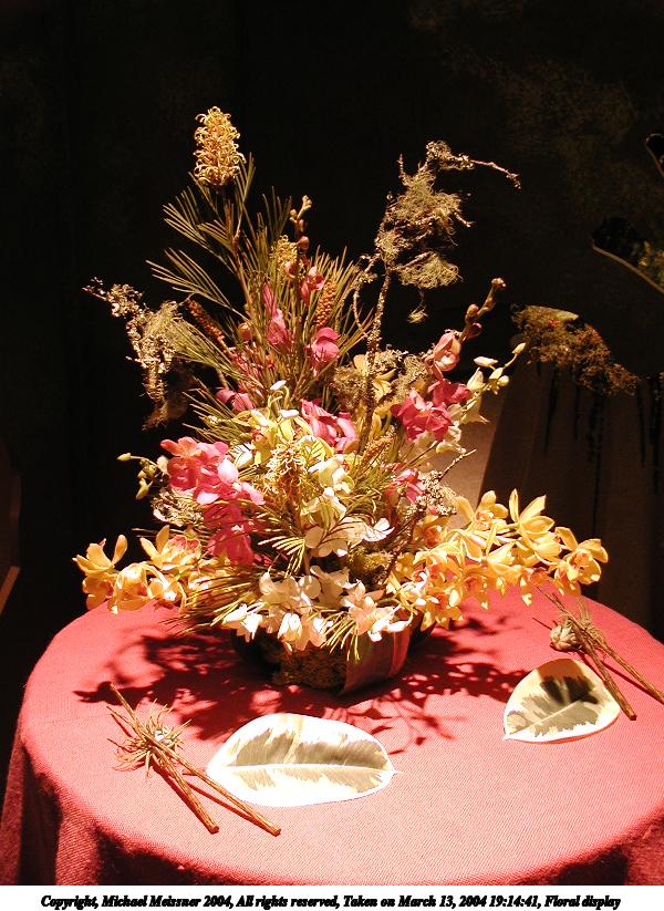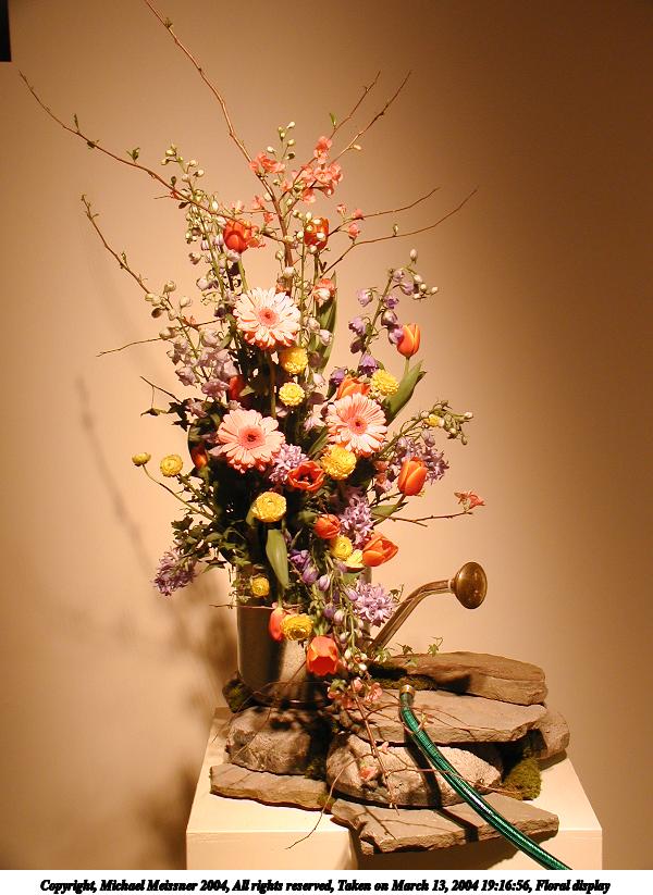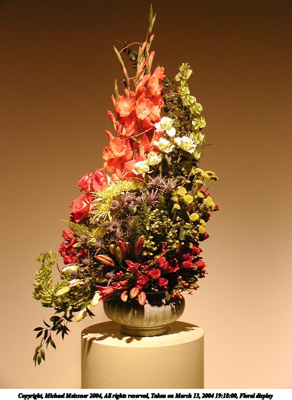 Picture #33: Floral display #6 600x823, 57,691 bytes (57K), (html file) Copyright, Michael Meissner 2004, All rights reserved Olympus C-2100UZ camera f/2.8, ISO 100, 1/250 sec, 10.5mm, auto mode, SHQ, fluorescent, matrix metering 35mm equivalent focal length 58.0mm Taken by Michael Meissner on March 13, 2004 19:16:11 Last modified on March 28, 2004 at 21:03 Shutter speed of 1/125 or 1/250 may indicate use of flash |