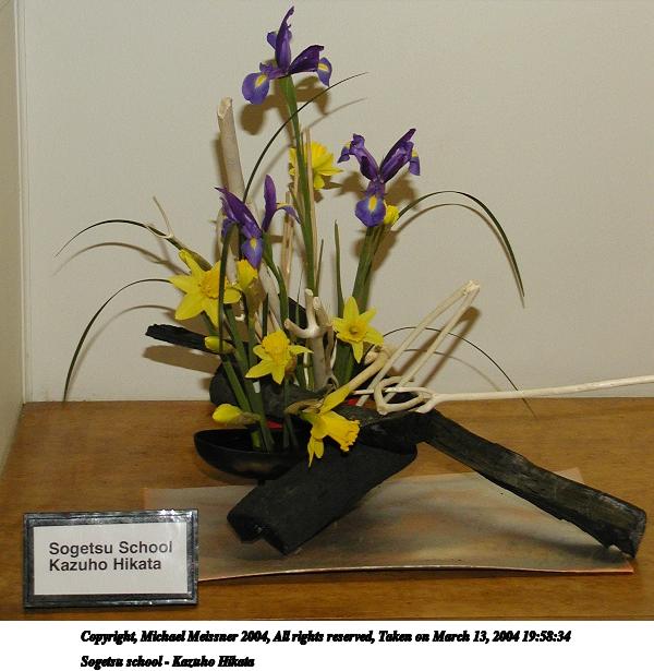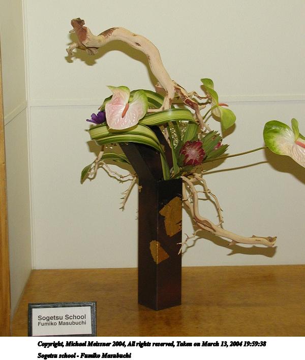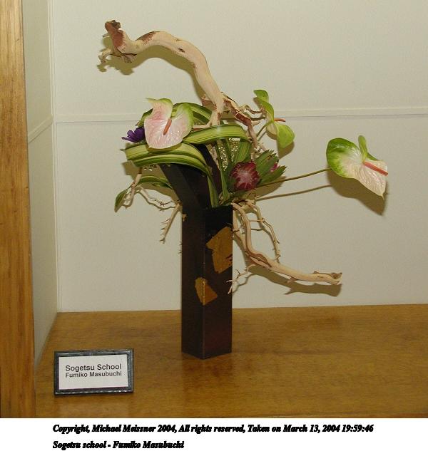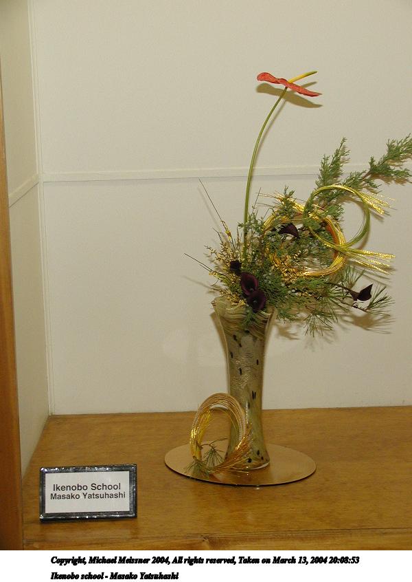 Picture #74: Ikenobo school - Masako Yatsuhashi 600x846, 64,092 bytes (63K), (html file) Copyright, Michael Meissner 2004, All rights reserved Olympus C-2100UZ camera f/2.8, ISO 200, 1/250 sec, 15.2mm, shutter priority, SHQ, cloudy, matrix metering 35mm equivalent focal length 84.0mm Taken by Michael Meissner on March 13, 2004 20:08:53 Last modified on March 28, 2004 at 21:31 Shutter speed of 1/125 or 1/250 may indicate use of flash |