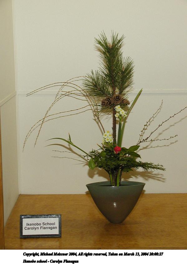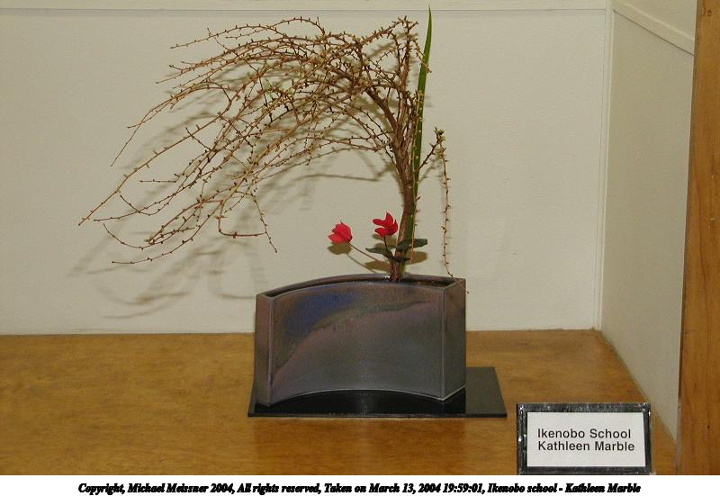 Picture #66: Ikenobo school - Kathleen Marble 800x551, 63,213 bytes (62K), (html file) Copyright, Michael Meissner 2004, All rights reserved Olympus C-2100UZ camera f/2.8, ISO 200, 1/250 sec, 15.2mm, shutter priority, SHQ, cloudy, matrix metering 35mm equivalent focal length 84.0mm Taken by Michael Meissner on March 13, 2004 19:59:01 Last modified on March 28, 2004 at 21:22 Shutter speed of 1/125 or 1/250 may indicate use of flash |