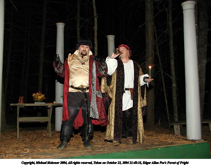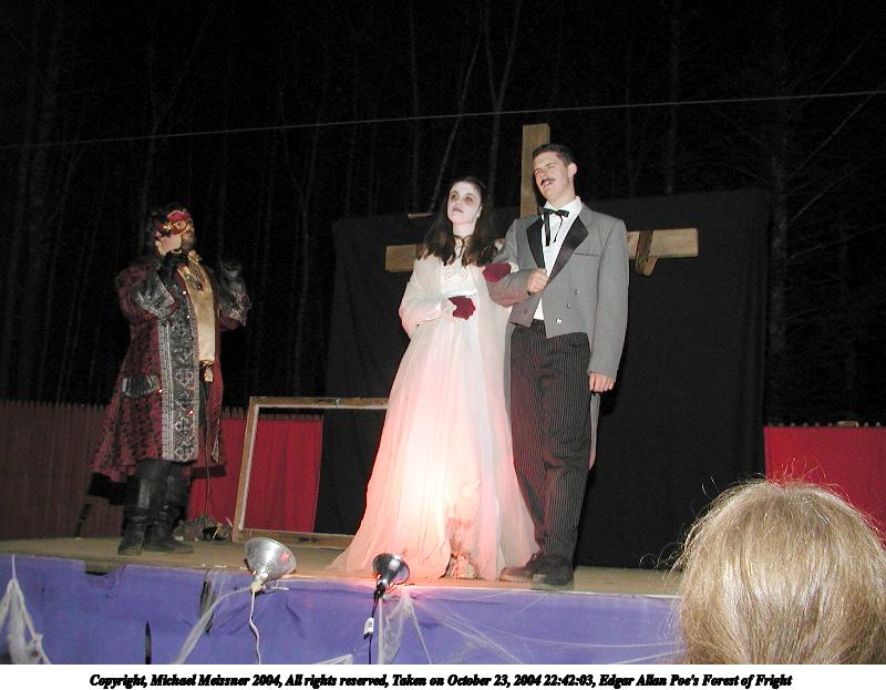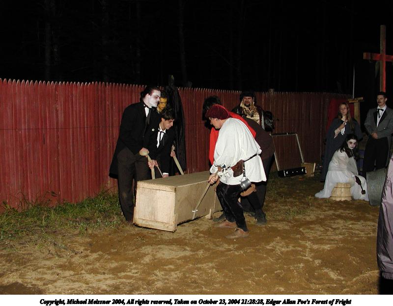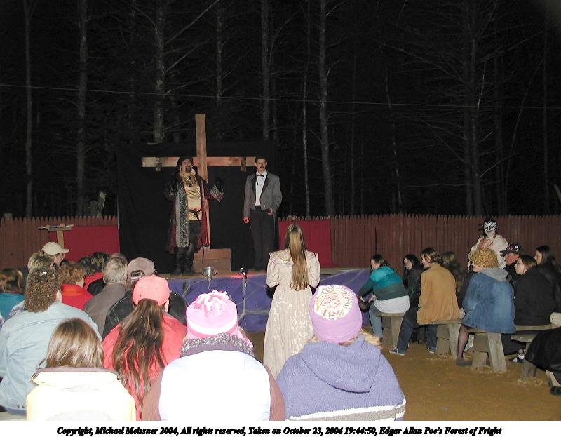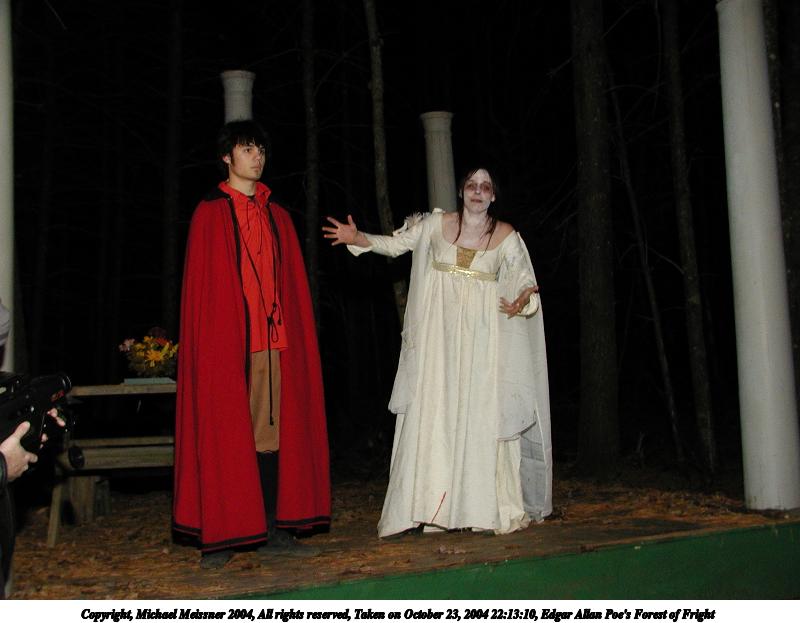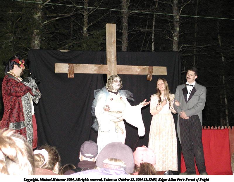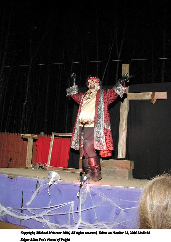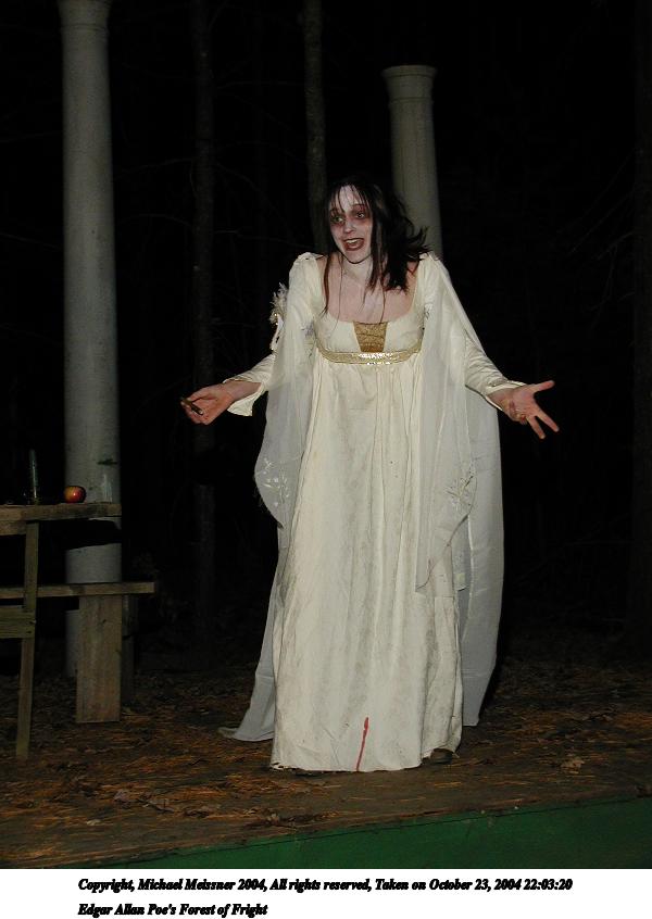 Picture #2: Edgar Allan Poe's Forest of Fright #2 800x623, 62,318 bytes (61K), (html file) Copyright, Michael Meissner 2004, All rights reserved Olympus C-2100UZ camera f/2.8, ISO 100, 1/100 sec, 23.2mm, auto mode, SHQ, cloudy, matrix metering 35mm equivalent focal length 129.0mm Extra equipment used: Promaster 5750DX flash Taken by Michael Meissner on October 23, 2004 19:42:03 Last modified on November 03, 2004 at 13:31 |