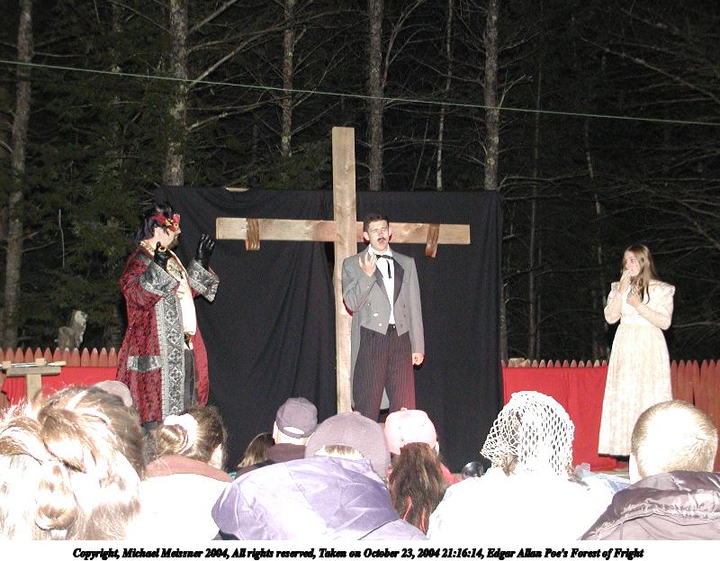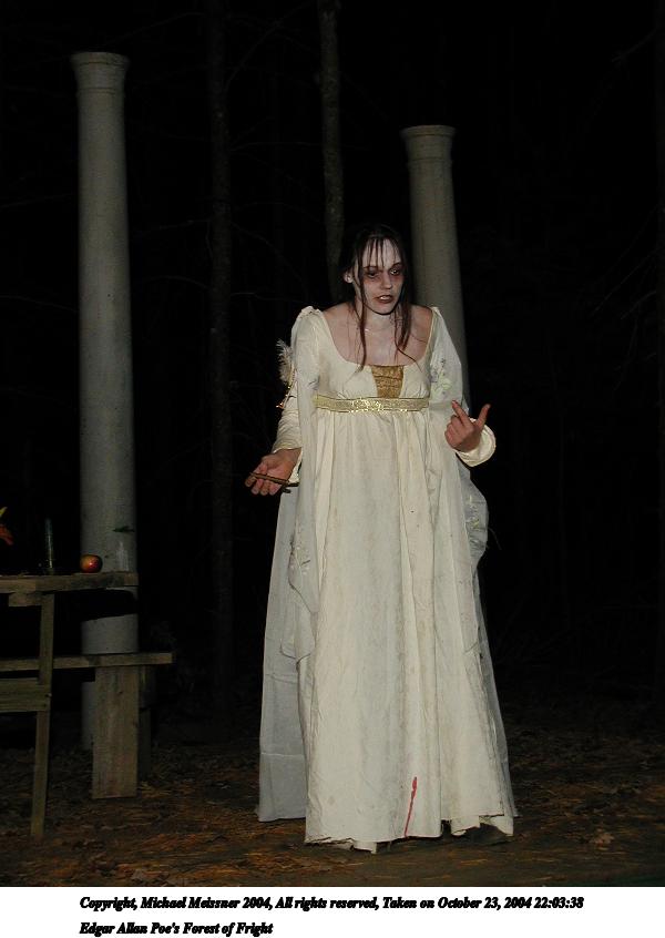 Picture #10: Edgar Allan Poe's Forest of Fright #10 600x846, 54,005 bytes (53K), (html file) Copyright, Michael Meissner 2004, All rights reserved Olympus C-2100UZ camera f/2.8, ISO 200, 1/50 sec, 11.6mm, auto mode, SHQ, cloudy, matrix metering 35mm equivalent focal length 64.0mm Extra equipment used: Promaster 5750DX flash Taken by Michael Meissner on October 23, 2004 22:03:20 Last modified on November 03, 2004 at 13:36 |