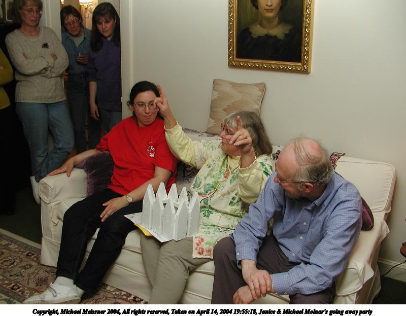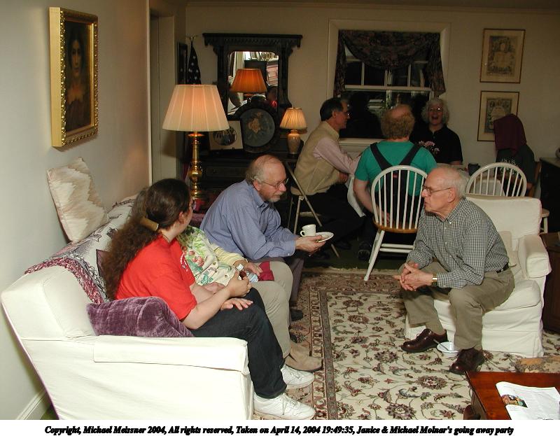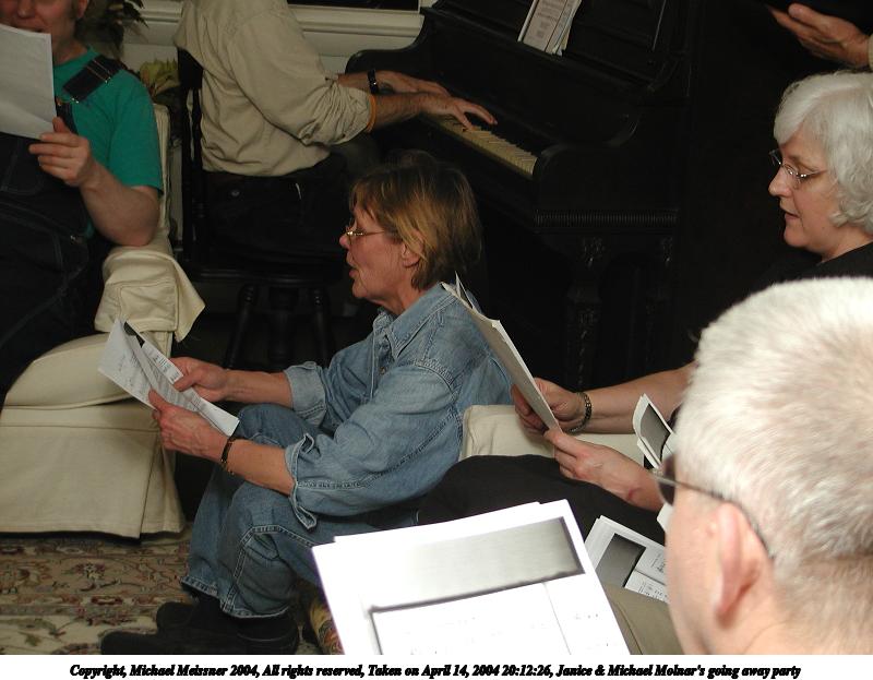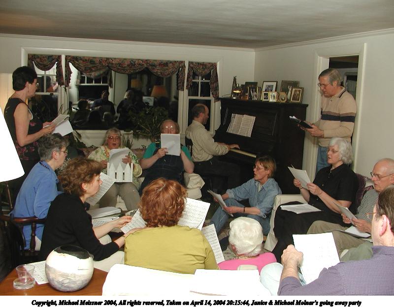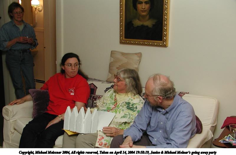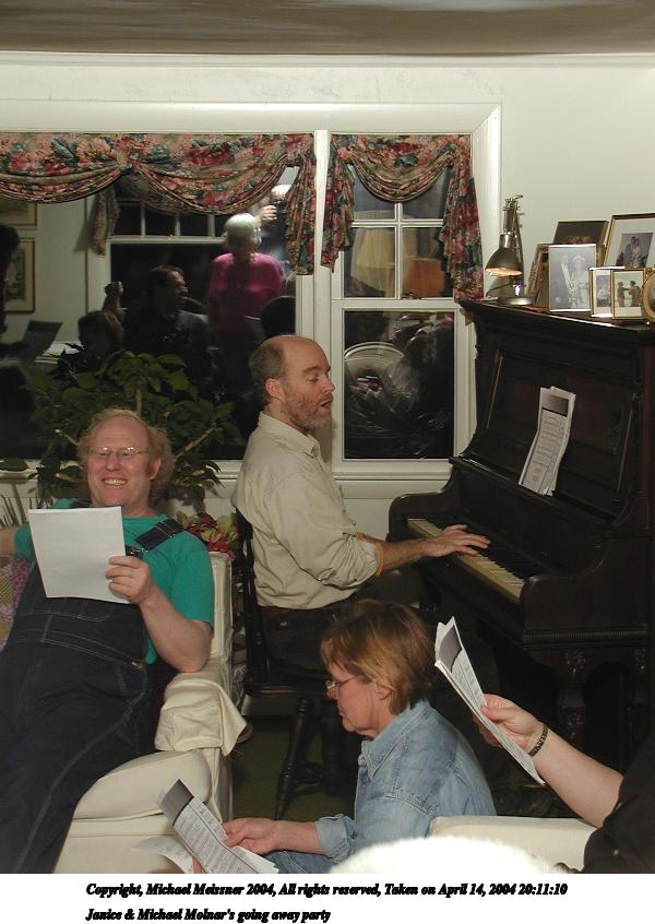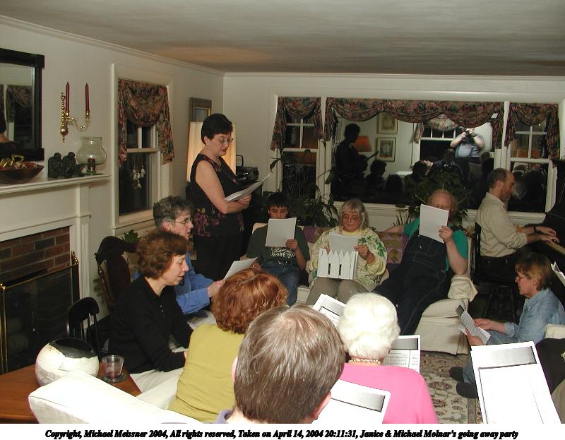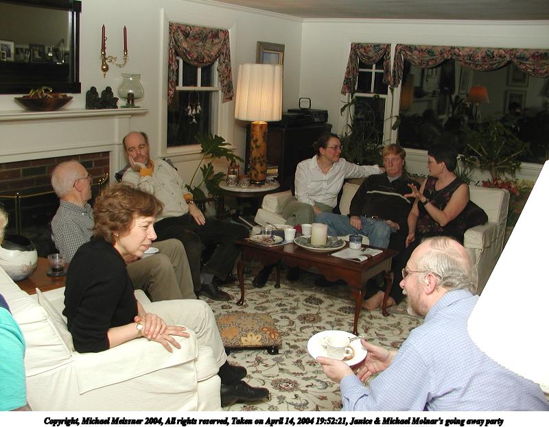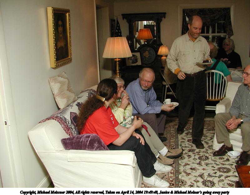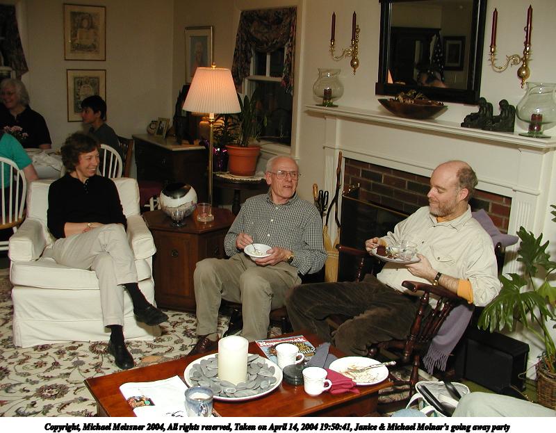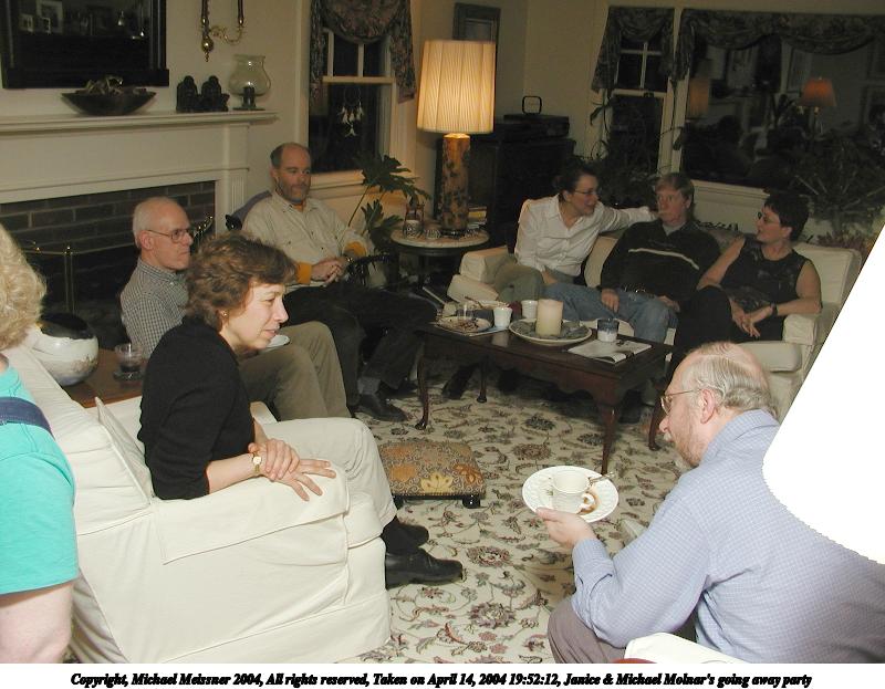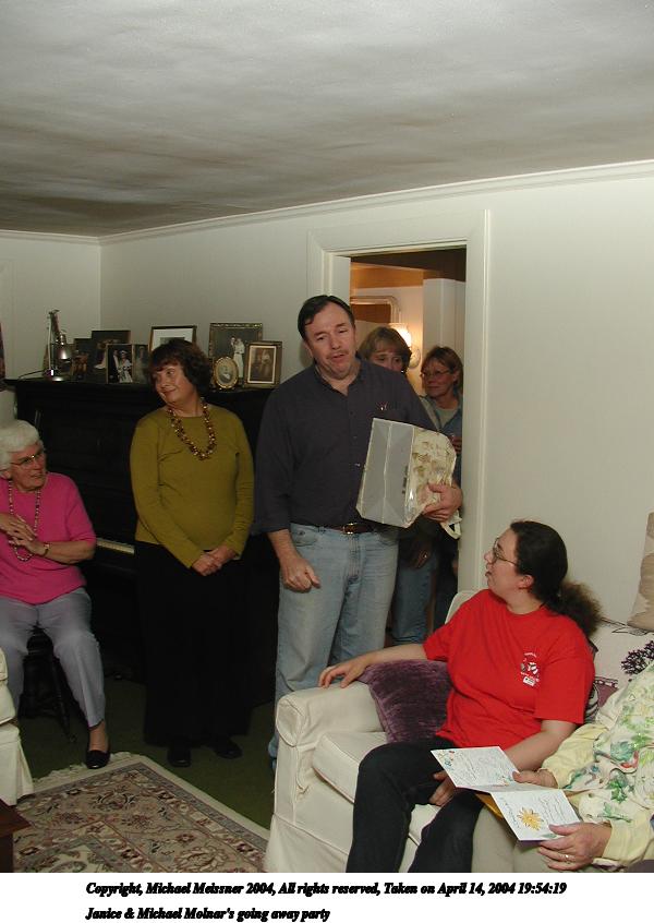 Picture #14: Janice & Michael Molnar's going away party #19 800x546, 63,909 bytes (63K), (html file) Copyright, Michael Meissner 2004, All rights reserved Olympus C-2100UZ camera f/2.8, ISO 100, 1/250 sec, 7.0mm, shutter priority, SHQ, cloudy, matrix metering 35mm equivalent focal length 39.0mm Taken by Michael Meissner on April 14, 2004 19:57:19 Last modified on April 14, 2004 at 22:07 Shutter speed of 1/125 or 1/250 may indicate use of flash |