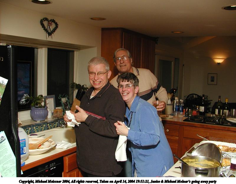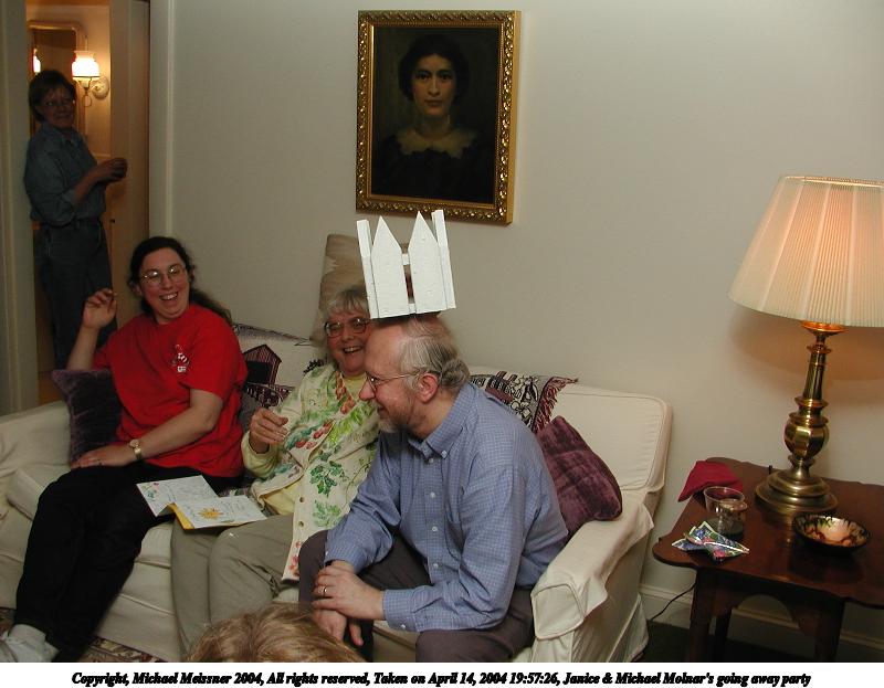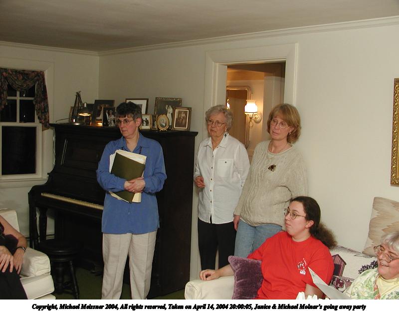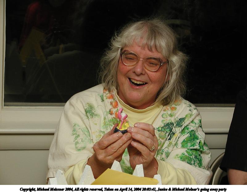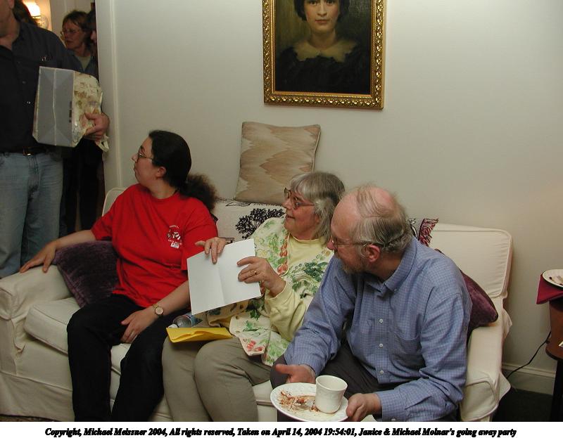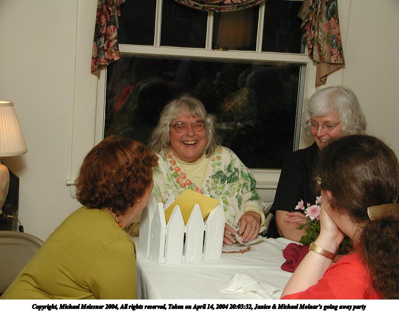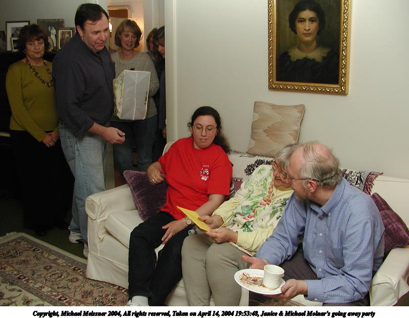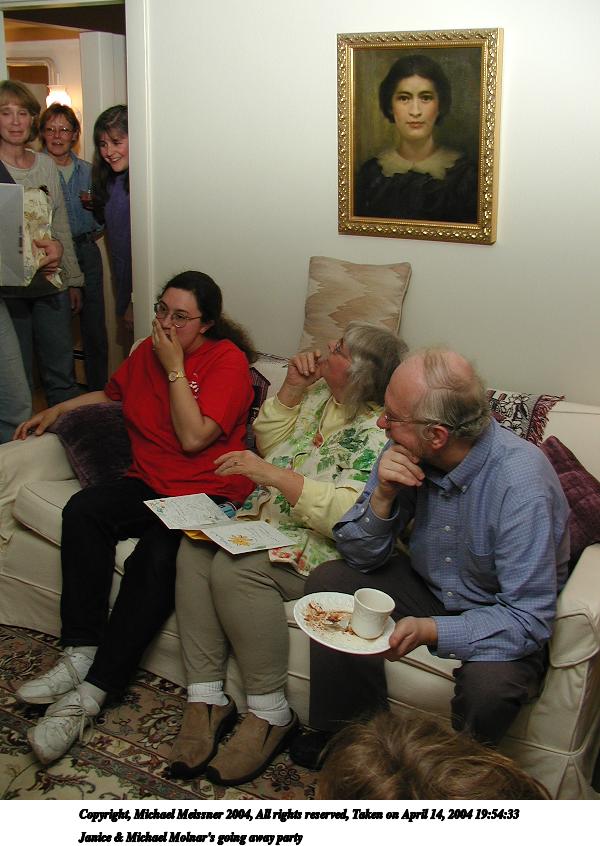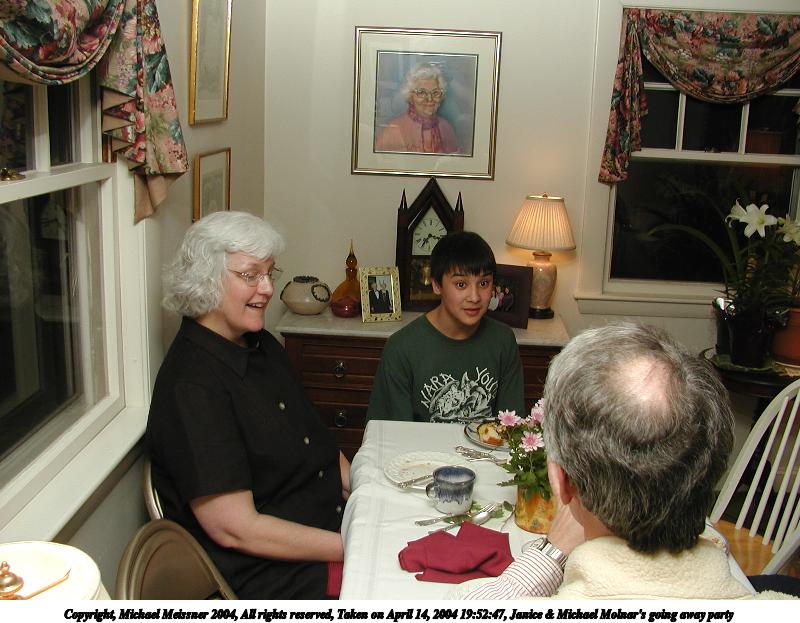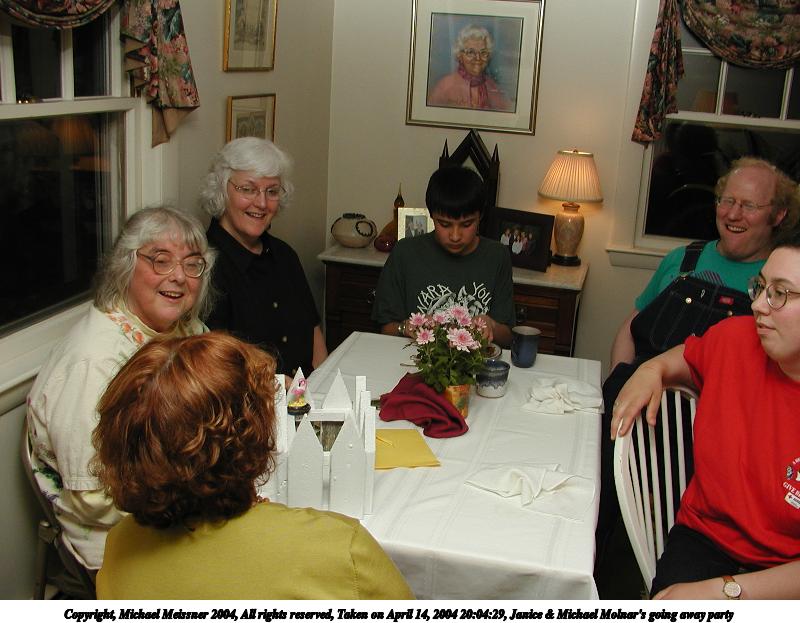 Picture #7: Janice & Michael Molnar's going away party #26 800x623, 65,289 bytes (64K), (html file) Copyright, Michael Meissner 2004, All rights reserved Olympus C-2100UZ camera f/2.8, ISO 100, 1/250 sec, 19.3mm, shutter priority, SHQ, cloudy, matrix metering 35mm equivalent focal length 107.0mm Taken by Michael Meissner on April 14, 2004 20:03:41 Last modified on April 14, 2004 at 22:54 Shutter speed of 1/125 or 1/250 may indicate use of flash |