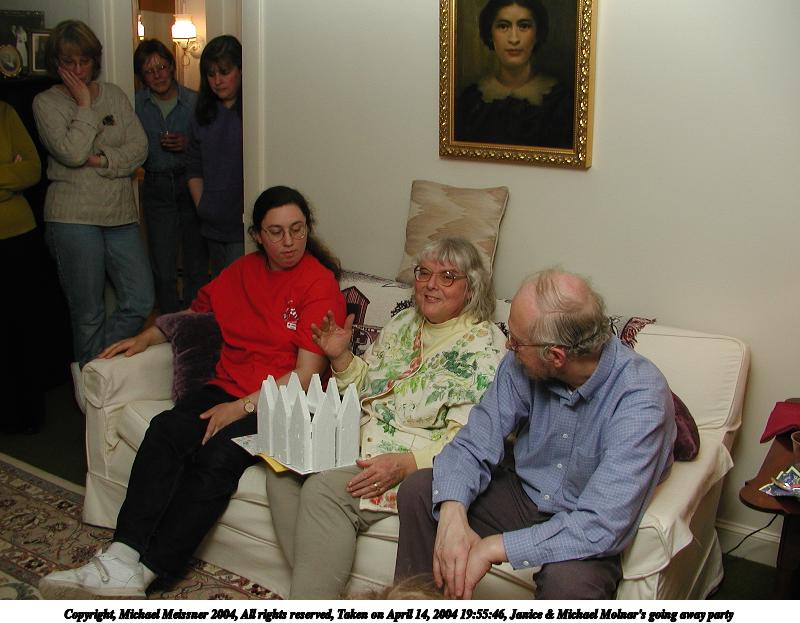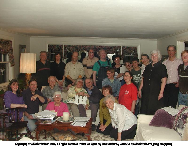 Picture #31: Janice & Michael Molnar's going away party #2 800x623, 82,863 bytes (81K), (html file) Copyright, Michael Meissner 2004, All rights reserved Olympus C-2100UZ camera f/2.8, ISO 100, 1/250 sec, 7.0mm, shutter priority, SHQ, cloudy, matrix metering 35mm equivalent focal length 39.0mm Taken by Michael Meissner on April 14, 2004 19:49:48 Last modified on April 14, 2004 at 21:46 Shutter speed of 1/125 or 1/250 may indicate use of flash |