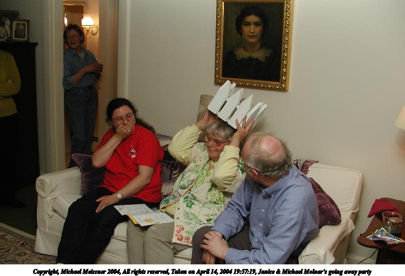 Picture #4: Janice & Michael Molnar's going away party #29 600x846, 81,127 bytes (80K), (html file) Copyright, Michael Meissner 2004, All rights reserved Olympus C-2100UZ camera f/2.8, ISO 100, 1/250 sec, 13.4mm, shutter priority, SHQ, cloudy, matrix metering 35mm equivalent focal length 74.0mm Taken by Michael Meissner on April 14, 2004 20:11:10 Last modified on April 14, 2004 at 23:05 Shutter speed of 1/125 or 1/250 may indicate use of flash |