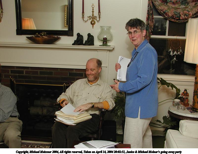Picture #15: Janice & Michael Molnar's going away party #18 800x623, 97,248 bytes (95K), (html file) Copyright, Michael Meissner 2004, All rights reserved Olympus C-2100UZ camera f/2.8, ISO 100, 1/250 sec, 7.0mm, shutter priority, SHQ, cloudy, matrix metering 35mm equivalent focal length 39.0mm Taken by Michael Meissner on April 14, 2004 19:57:06 Last modified on April 14, 2004 at 22:05 Shutter speed of 1/125 or 1/250 may indicate use of flash |