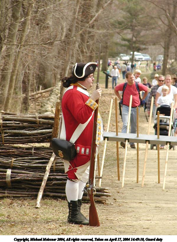 Picture #36: Guard duty 600x823, 114,398 bytes (112K), (html file) Copyright, Michael Meissner 2004, All rights reserved Olympus C-2100UZ camera f/3.5, ISO 100, 1/500 sec, 43.5mm, auto mode, SHQ, cloudy, matrix metering 35mm equivalent focal length 241.0mm Taken by Michael Meissner on April 17, 2004 14:49:10 Last modified on April 24, 2004 at 08:27 |