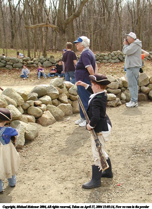 Picture #24: Now we ram in the powder 600x823, 154,957 bytes (152K), (html file) Copyright, Michael Meissner 2004, All rights reserved Olympus C-2100UZ camera f/3.2, ISO 100, 1/650 sec, 11.0mm, auto mode, SHQ, cloudy, matrix metering 35mm equivalent focal length 61.0mm Taken by Michael Meissner on April 17, 2004 15:05:14 Last modified on April 24, 2004 at 08:34 |
