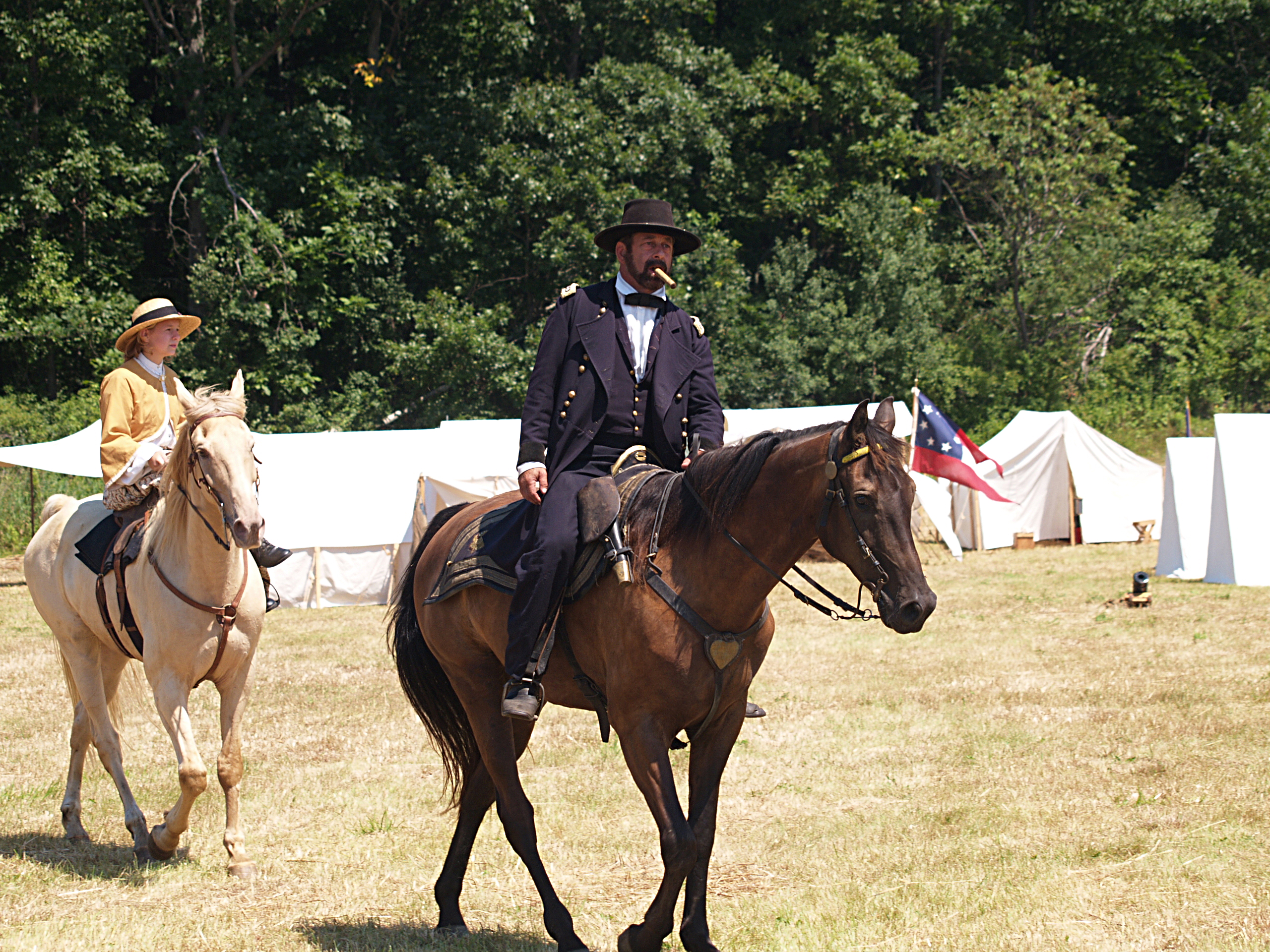 Picture #1: Reenactors portraying Ulysses S. Grant and daughter Small: 640x526, 109,757 bytes (108K), (html file) Large: 2560x1920, 5,042,256 bytes (4.8M), (html file) Copyright, Michael Meissner 2005, All rights reserved Olympus E-1 camera with Sigma 55-200mm f/4.0-5.6 lens f/6.3, ISO 100, 1/320 sec, 55.0mm, auto mode, SHQ, matrix metering, +2 sharpening 35mm equivalent focal length 110.0mm Taken by Michael Meissner on July 30, 2005 13:51:42 Last modified on July 30, 2005 at 22:48 |