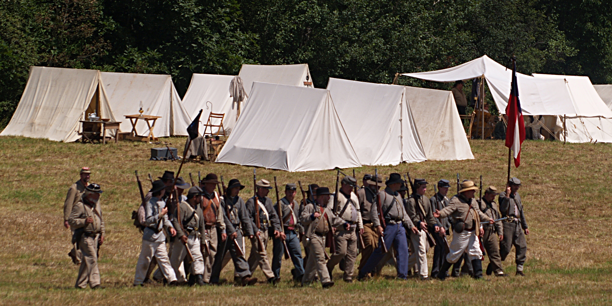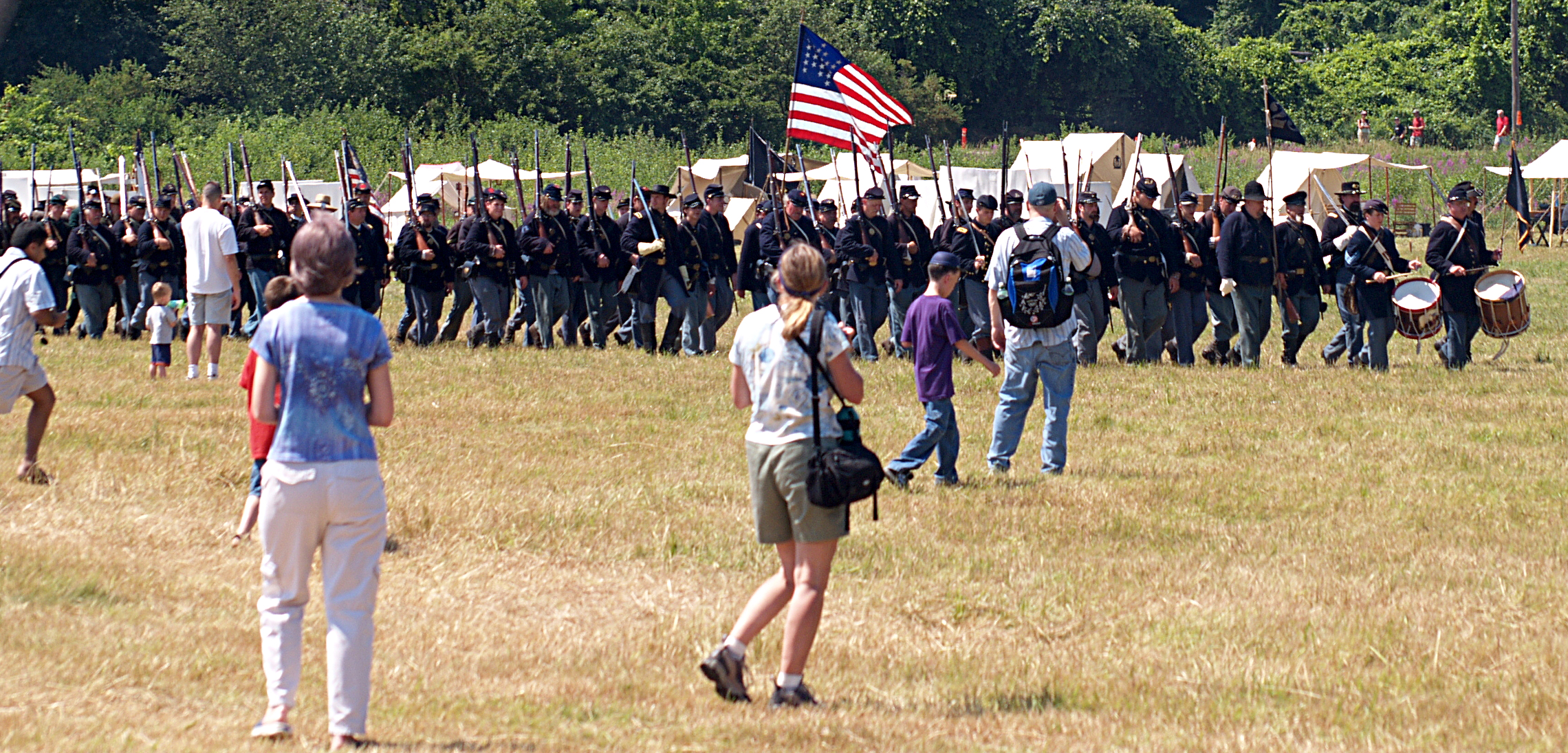 Picture #12: The union army gets into position Small: 620x223, 63,269 bytes (62K), (html file) Large: 2480x800, 2,589,595 bytes (2.5M), (html file) Copyright, Michael Meissner 2005, All rights reserved Olympus E-1 camera with Sigma 55-200mm f/4.0-5.6 lens f/6.3, ISO 100, 1/320 sec, 55.0mm, auto mode, SHQ, matrix metering, +2 sharpening 35mm equivalent focal length 110.0mm Taken by Michael Meissner on July 30, 2005 14:11:04 Last modified on July 30, 2005 at 22:49 |