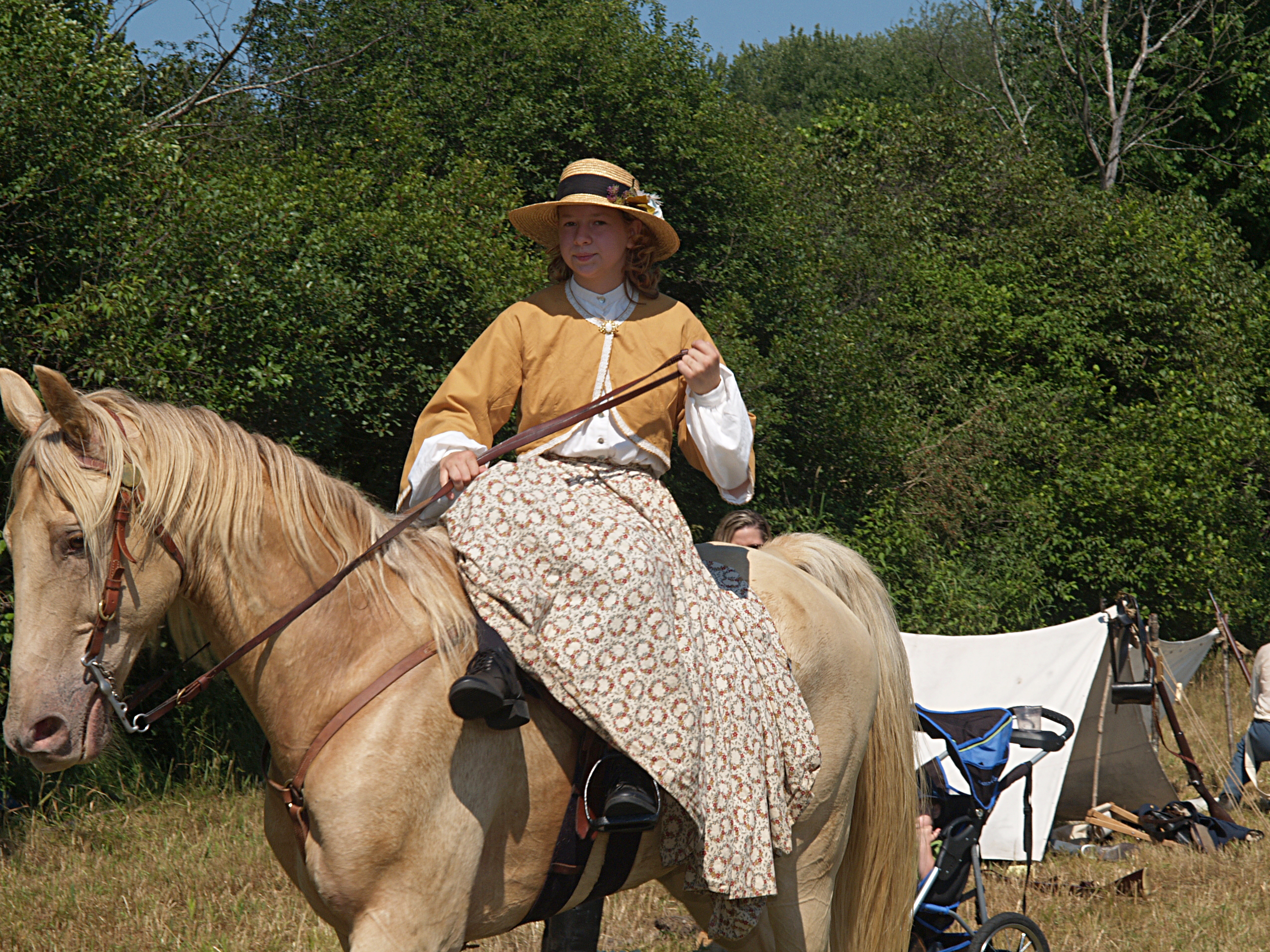 Picture #4: Reenactors portraying Ulysses S. Grant and daughter #2 Small: 640x526, 78,303 bytes (77K), (html file) Large: 2560x1920, 4,836,634 bytes (4.6M), (html file) Copyright, Michael Meissner 2005, All rights reserved Olympus E-1 camera with Sigma 55-200mm f/4.0-5.6 lens f/7.1, ISO 100, 1/400 sec, 55.0mm, auto mode, SHQ, matrix metering, +2 sharpening 35mm equivalent focal length 110.0mm Taken by Michael Meissner on July 30, 2005 14:04:48 Last modified on July 30, 2005 at 22:49 |