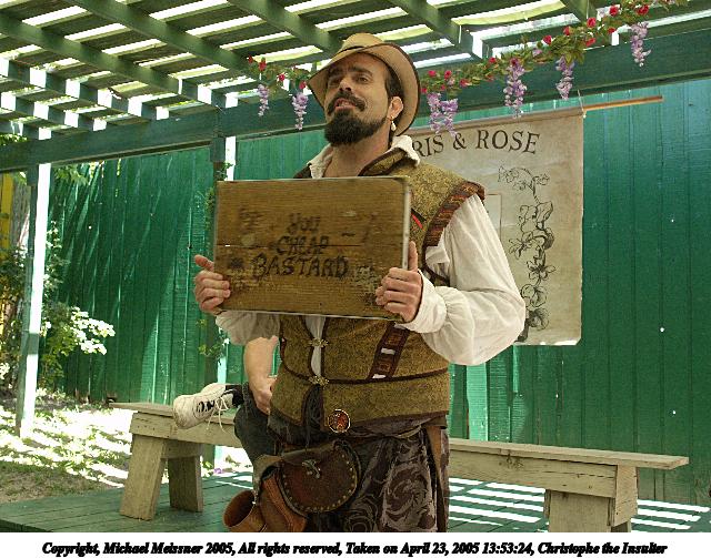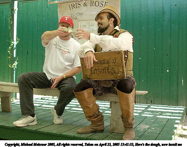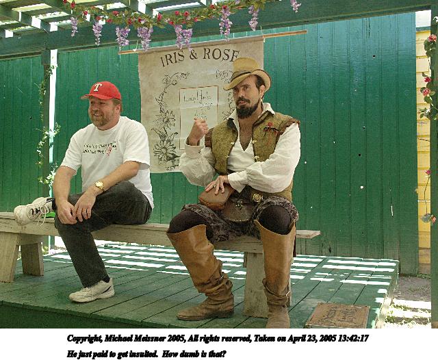 Picture #7: He just paid to get insulted. How dumb is that? Thumb: 320x240, 33,311 bytes (33K) Small: 640x526, 91,578 bytes (90K), (html file) Large: 2560x1920, 5,848,460 bytes (5.6M), (html file) Copyright, Michael Meissner 2005, All rights reserved Olympus E-1 camera with Olympus 14-54mm f/2.8-3.5 lens f/5.0, ISO 400, 1/125 sec, 19.0mm, auto mode, SHQ, matrix metering, -2 contrast, +2 sharpening 35mm equivalent focal length 38.0mm Taken by Michael Meissner on April 23, 2005 13:42:17 Last modified on May 29, 2005 at 23:39 |