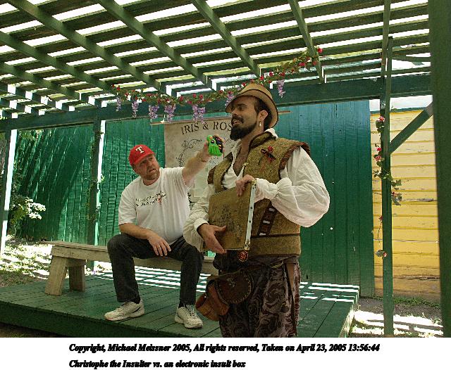 Picture #10: Christophe the Insulter vs. an electronic insult box Thumb: 320x240, 38,158 bytes (38K) Small: 640x526, 106,437 bytes (104K), (html file) Large: 2560x1920, 5,765,291 bytes (5.5M), (html file) Copyright, Michael Meissner 2005, All rights reserved Olympus E-1 camera with Olympus 14-54mm f/2.8-3.5 lens f/5.6, ISO 400, 1/125 sec, 14.0mm, auto mode, SHQ, matrix metering, -2 contrast, +2 sharpening 35mm equivalent focal length 28.0mm Taken by Michael Meissner on April 23, 2005 13:56:44 Last modified on May 30, 2005 at 09:31 |