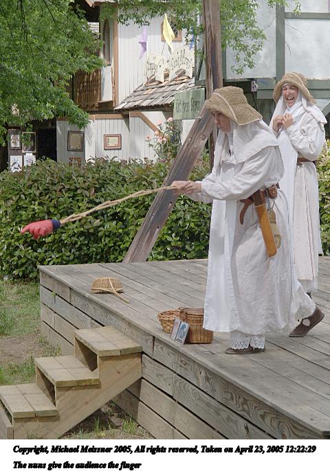 Picture #1: The nuns give the audience the finger Thumb: 240x320, 34,991 bytes (35K) Small: 480x686, 95,111 bytes (93K), (html file) Large: 1920x2560, 5,247,869 bytes (5.0M), (html file) Copyright, Michael Meissner 2005, All rights reserved Olympus E-1 camera with Olympus 14-54mm f/2.8-3.5 lens f/5.0, ISO 100, 1/250 sec, 54.0mm, auto mode, SHQ, matrix metering, -2 contrast, +2 sharpening 35mm equivalent focal length 108.0mm Taken by Michael Meissner on April 23, 2005 12:22:29 Last modified on May 30, 2005 at 10:25 |