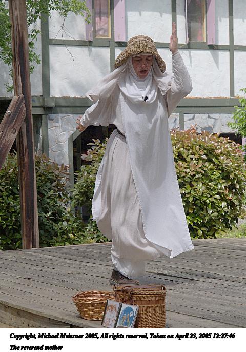 Picture #7: The reverend mother Thumb: 240x320, 33,195 bytes (33K) Small: 480x686, 88,671 bytes (87K), (html file) Large: 1920x2560, 5,945,446 bytes (5.7M), (html file) Copyright, Michael Meissner 2005, All rights reserved Olympus E-1 camera with Olympus 14-54mm f/2.8-3.5 lens f/5.6, ISO 100, 1/320 sec, 54.0mm, auto mode, SHQ, matrix metering, -2 contrast, +2 sharpening 35mm equivalent focal length 108.0mm Taken by Michael Meissner on April 23, 2005 12:27:46 Last modified on May 30, 2005 at 13:40 |