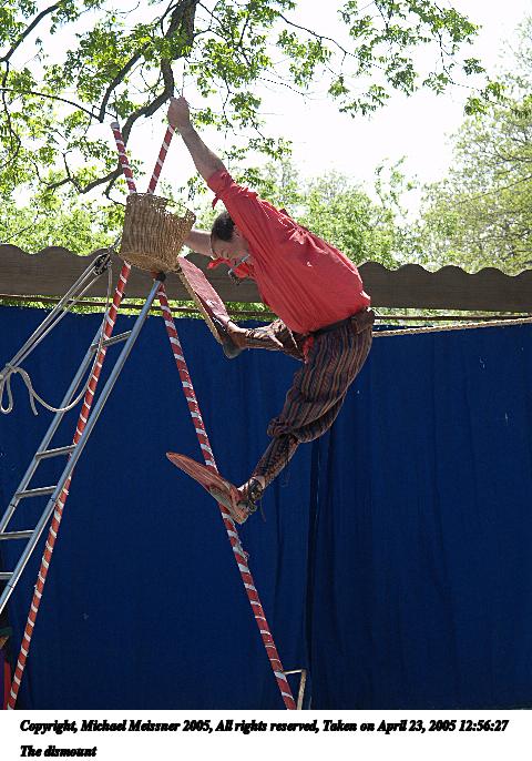 Picture #6: The dismount Thumb: 240x320, 35,187 bytes (35K) Small: 480x686, 91,251 bytes (90K), (html file) Large: 1920x2560, 5,124,588 bytes (4.9M), (html file) Copyright, Michael Meissner 2005, All rights reserved Olympus E-1 camera with Olympus 14-54mm f/2.8-3.5 lens f/5.0, ISO 100, 1/250 sec, 52.0mm, auto mode, SHQ, center weight metering, -2 contrast, +2 sharpening 35mm equivalent focal length 104.0mm Taken by Michael Meissner on April 23, 2005 12:56:27 Last modified on June 01, 2005 at 18:12 |
