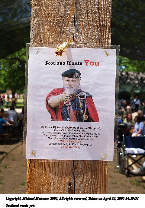 Picture #2: Scotland wants you Thumb: 240x320, 34,264 bytes (34K) Small: 480x686, 93,878 bytes (92K), (html file) Large: 1920x2560, 5,930,327 bytes (5.7M), (html file) Copyright, Michael Meissner 2005, All rights reserved Olympus E-1 camera with Olympus 14-54mm f/2.8-3.5 lens f/7.1, ISO 100, 1/320 sec, 31.0mm, auto mode, SHQ, matrix metering, -2 contrast, +2 sharpening 35mm equivalent focal length 62.0mm Taken by Michael Meissner on April 23, 2005 14:19:31 Last modified on June 02, 2005 at 08:01 |