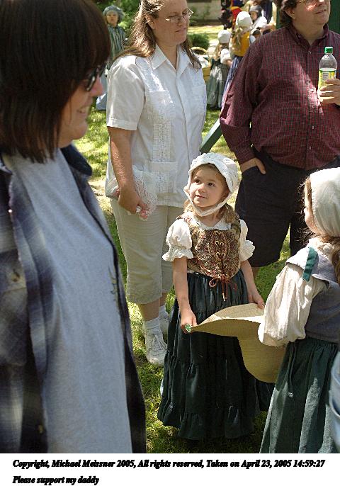 Picture #3: Please support my daddy Thumb: 320x240, 34,203 bytes (34K) Small: 640x503, 87,458 bytes (86K), (html file) Large: 2560x1920, 5,788,933 bytes (5.5M), (html file) Copyright, Michael Meissner 2005, All rights reserved Olympus E-1 camera with Olympus 14-54mm f/2.8-3.5 lens f/5.0, ISO 100, 1/125 sec, 20.0mm, auto mode, SHQ, matrix metering, -2 contrast, +2 sharpening 35mm equivalent focal length 40.0mm Taken by Michael Meissner on April 23, 2005 14:59:04 Last modified on June 02, 2005 at 08:16 |