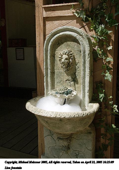 Picture #13: Lion fountain Thumb: 240x320, 28,499 bytes (28K) Small: 480x686, 80,068 bytes (79K), (html file) Large: 1920x2560, 5,428,615 bytes (5.2M), (html file) Copyright, Michael Meissner 2005, All rights reserved Olympus E-1 camera with Olympus 14-54mm f/2.8-3.5 lens f/8.0, ISO 100, 1/320 sec, 22.0mm, auto mode, SHQ, spot metering, -2 contrast, +2 sharpening 35mm equivalent focal length 44.0mm Taken by Michael Meissner on April 23, 2005 16:25:09 Last modified on June 02, 2005 at 08:39 |