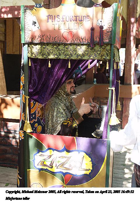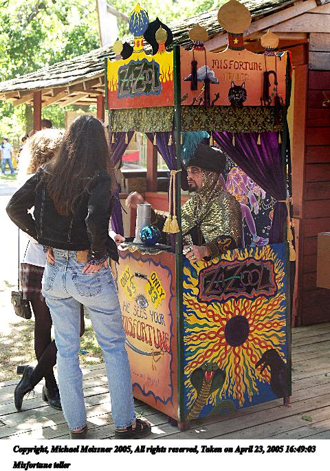 Picture #15: Misfortune teller #2 Thumb: 240x320, 40,671 bytes (40K) Small: 480x686, 101,757 bytes (100K), (html file) Large: 1920x2560, 5,114,127 bytes (4.9M), (html file) Copyright, Michael Meissner 2005, All rights reserved Olympus E-1 camera with Olympus 14-54mm f/2.8-3.5 lens f/3.5, ISO 100, 1/80 sec, 22.0mm, auto mode, SHQ, matrix metering, -2 contrast, +2 sharpening 35mm equivalent focal length 44.0mm Taken by Michael Meissner on April 23, 2005 16:49:32 Last modified on June 02, 2005 at 08:44 |