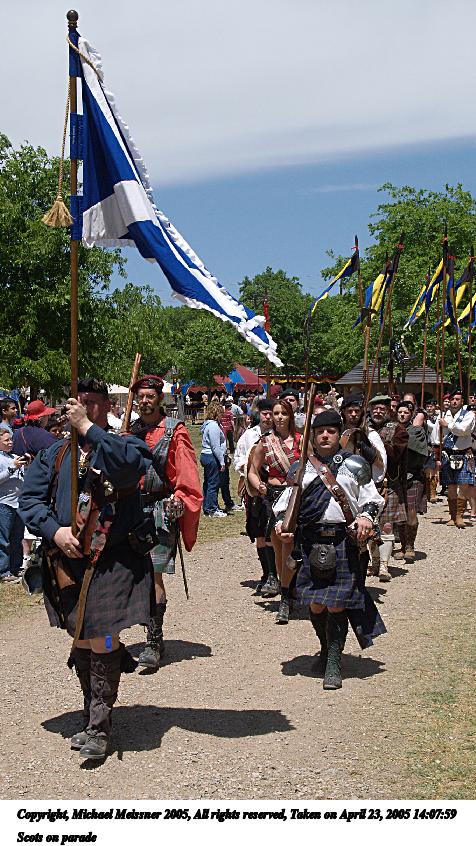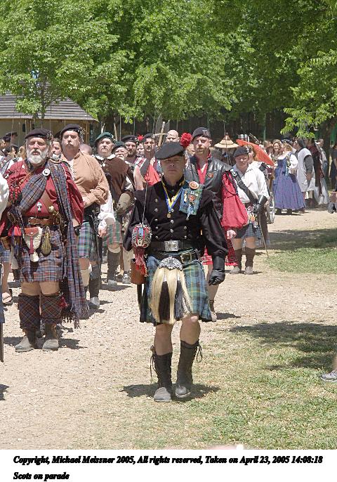 Picture #6: Scots on parade #2 Thumb: 240x320, 40,382 bytes (40K) Small: 480x686, 111,910 bytes (110K), (html file) Large: 1920x2560, 5,188,185 bytes (4.9M), (html file) Copyright, Michael Meissner 2005, All rights reserved Olympus E-1 camera with Olympus 14-54mm f/2.8-3.5 lens f/6.3, ISO 100, 1/250 sec, 22.0mm, auto mode, SHQ, matrix metering, -2 contrast, +2 sharpening 35mm equivalent focal length 44.0mm Taken by Michael Meissner on April 23, 2005 14:08:10 Last modified on June 03, 2005 at 08:27 |