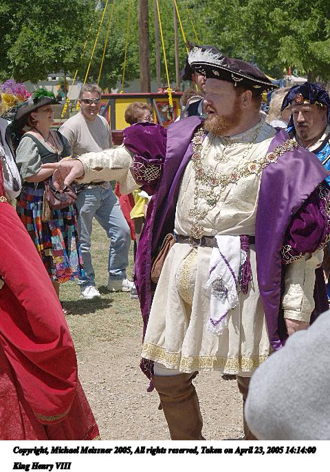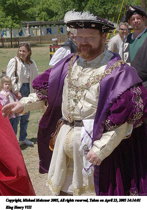Picture #15: King Henry VIII #2 Thumb: 240x320, 35,811 bytes (35K) Small: 480x686, 94,076 bytes (92K), (html file) Large: 1920x2560, 6,010,714 bytes (5.7M), (html file) Copyright, Michael Meissner 2005, All rights reserved Olympus E-1 camera with Olympus 14-54mm f/2.8-3.5 lens f/8.0, ISO 100, 1/500 sec, 40.0mm, auto mode, SHQ, matrix metering, -2 contrast, +2 sharpening 35mm equivalent focal length 80.0mm Taken by Michael Meissner on April 23, 2005 14:14:01 Last modified on June 03, 2005 at 08:48 |