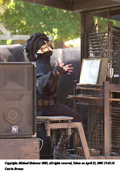 Picture #3: Cast in Bronze #3 Thumb: 437x327, 61,199 bytes (60K) Small: 874x678, 165,534 bytes (162K), (html file) Large: 2622x1964, 948,075 bytes (926K), (html file) Copyright, Michael Meissner 2005, All rights reserved Olympus E-1 camera with Olympus 14-54mm f/2.8-3.5 lens f/4.0, ISO 200, 1/125 sec, 54.0mm, auto mode, SHQ, spot metering, -2 contrast, +2 sharpening 35mm equivalent focal length 108.0mm Taken by Michael Meissner on April 23, 2005 17:34:22 Last modified on June 04, 2005 at 12:46 Processed from the RAW file |