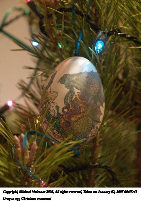 Picture #3: Dragon egg Christmas ornament 480x686, 59,779 bytes (59K), (html file) Copyright, Michael Meissner 2005, All rights reserved Olympus E-1 camera with Olympus 14-54mm f/2.8-3.5 lens f/3.2, ISO 400, 1/25 sec, 35.0mm, auto mode, SHQ, matrix metering, +1 sharpening, auto focus left 35mm equivalent focal length 70.0mm Extra equipment used: handheld Taken by Michael Meissner on January 02, 2005 00:38:41 Last modified on January 02, 2005 at 14:36 |