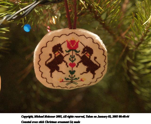Picture #5: Counted cross stich Christmas ornament Liz made #2 640x526, 73,227 bytes (72K), (html file) Copyright, Michael Meissner 2005, All rights reserved Olympus E-1 camera with Olympus 14-54mm f/2.8-3.5 lens f/3.3, ISO 400, 1/30 sec, 43.0mm, auto mode, SHQ, matrix metering, +1 sharpening, auto focus right 35mm equivalent focal length 86.0mm Extra equipment used: handheld Taken by Michael Meissner on January 02, 2005 00:42:34 Last modified on January 02, 2005 at 19:22 |