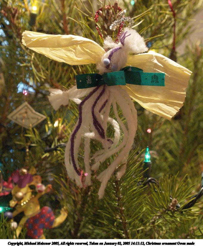Picture #9: Christmas ornament Gwen made 681x823, 108,751 bytes (107K), (html file) Copyright, Michael Meissner 2005, All rights reserved Olympus E-1 camera with Olympus 14-54mm f/2.8-3.5 lens f/4.0, ISO 800, 1/30 sec, 25.0mm, aperture priority, SHQ, center weight metering, +1 sharpening, auto focus right 35mm equivalent focal length 50.0mm Extra equipment used: handheld Taken by Michael Meissner on January 02, 2005 14:11:12 Last modified on January 02, 2005 at 19:29 |