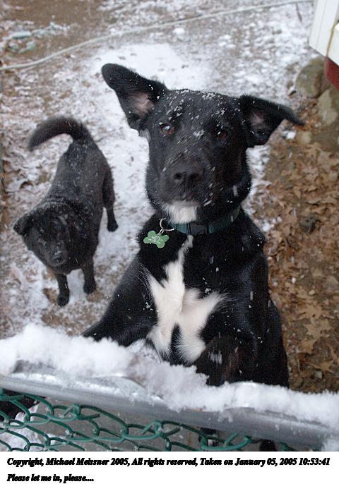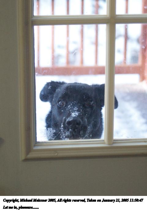 Picture #3: Please let me in, please.... 480x686, 73,396 bytes (72K), (html file) Copyright, Michael Meissner 2005, All rights reserved Olympus E-1 camera with Olympus 14-54mm f/2.8-3.5 lens f/4.5, ISO 400, 1/100 sec, 20.0mm, auto mode, SHQ, matrix metering, +1 sharpening 35mm equivalent focal length 40.0mm Taken by Michael Meissner on January 05, 2005 10:53:41 Last modified on January 05, 2005 at 16:39 |