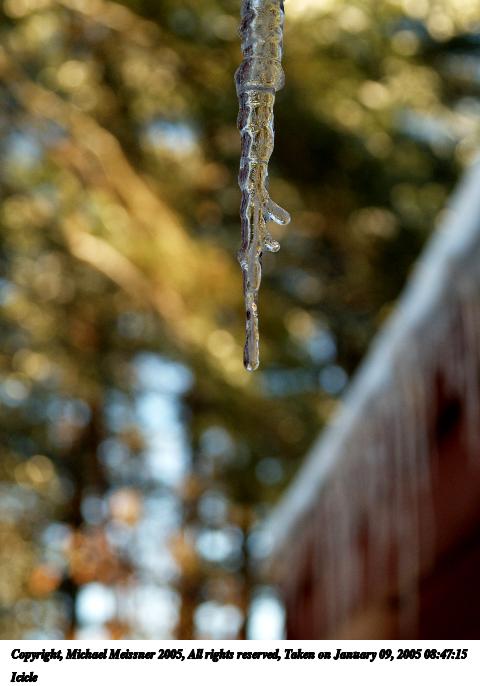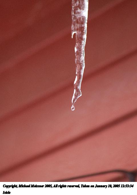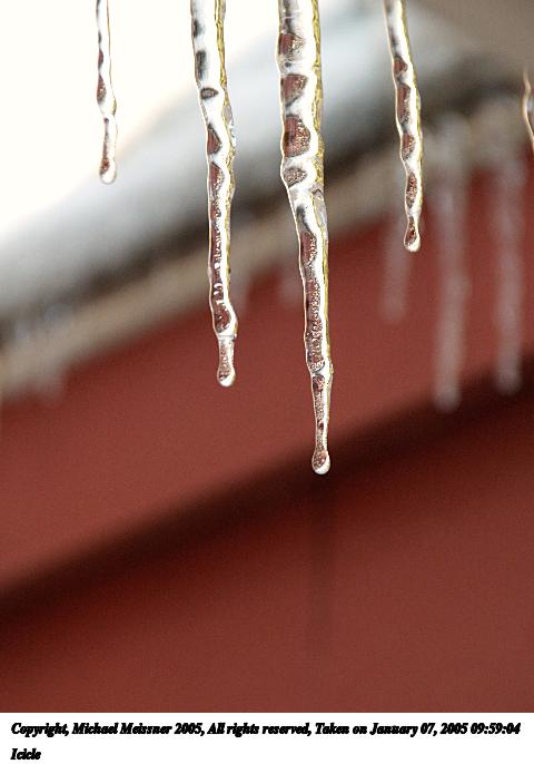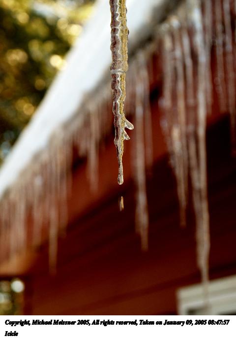 Picture #2: Icicle #2 480x686, 44,272 bytes (44K), (html file) Copyright, Michael Meissner 2005, All rights reserved Olympus E-1 camera with Sigma 18-125mm f/3.5-5.6 lens f/4.8, ISO 100, 1/80 sec, 44.0mm, auto mode, SHQ, matrix metering, +1 sharpening 35mm equivalent focal length 88.0mm Taken by Michael Meissner on January 09, 2005 08:47:15 Last modified on January 10, 2005 at 07:56 Normalization done in ImageMagick. |