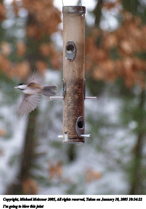 Picture #10: I'm going to blow this joint 480x686, 52,858 bytes (52K), (html file) Copyright, Michael Meissner 2005, All rights reserved Olympus E-1 camera with Sigma 55-200mm f/4.0-5.6 lens f/5.4, ISO 800, 1/200 sec, 160.0mm, auto mode, SHQ, matrix metering, +1 sharpening 35mm equivalent focal length 321.0mm Taken by Michael Meissner on January 10, 2005 10:34:22 Last modified on January 10, 2005 at 10:59 |