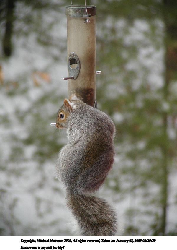 Picture #1: Excuse me, is my butt too big? 600x846, 64,157 bytes (63K), (html file) Copyright, Michael Meissner 2005, All rights reserved Olympus C-2100UZ camera f/2.8, ISO 200, 1/60 sec, 32.5mm, auto mode, SHQ, cloudy, matrix metering, macro 35mm equivalent focal length 180.0mm Taken by Michael Meissner on January 08, 2005 08:20:20 Last modified on January 16, 2005 at 23:07 |