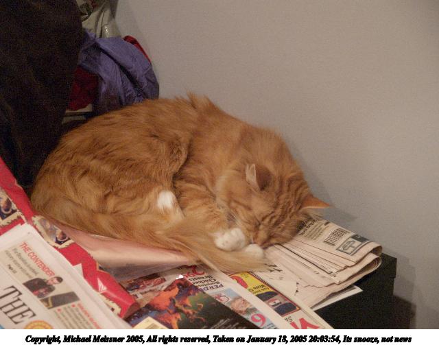 Picture #11: Its snooze, not news 640x503, 51,801 bytes (51K), (html file) Copyright, Michael Meissner 2005, All rights reserved Olympus E-1 camera with Olympus 14-54mm f/2.8-3.5 lens f/3.4, ISO 800, 1/40 sec, 47.0mm, auto mode, SHQ, matrix metering, +1 sharpening 35mm equivalent focal length 94.0mm Taken by Michael Meissner on January 18, 2005 20:03:54 Last modified on January 18, 2005 at 21:09 |