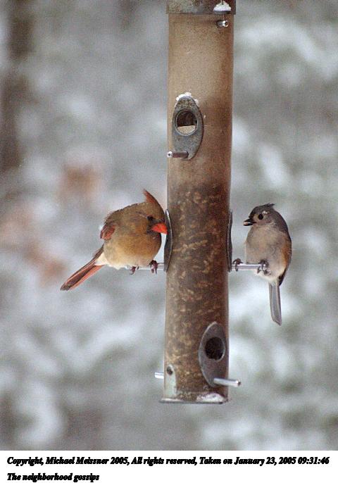 Picture #19: The neighborhood gossips 480x686, 53,400 bytes (53K), (html file) Copyright, Michael Meissner 2005, All rights reserved Olympus E-1 camera with Sigma 55-200mm f/4.0-5.6 lens f/5.5, ISO 800, 1/400 sec, 168.0mm, shutter priority, SHQ, matrix metering, +1 sharpening 35mm equivalent focal length 337.0mm Taken by Michael Meissner on January 23, 2005 09:31:46 Last modified on January 23, 2005 at 20:12 This was shot through the window. |