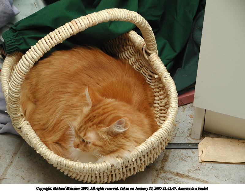 Picture #15: America in a basket 800x623, 92,216 bytes (91K), (html file) Copyright, Michael Meissner 2005, All rights reserved Olympus C-2100UZ camera f/2.8, ISO 100, 1/250 sec, 22.3mm, shutter priority, SHQ, cloudy, matrix metering 35mm equivalent focal length 124.0mm Extra equipment used: Promaster 5750DX flash Taken by Michael Meissner on January 23, 2005 21:31:07 Last modified on January 23, 2005 at 21:36 |