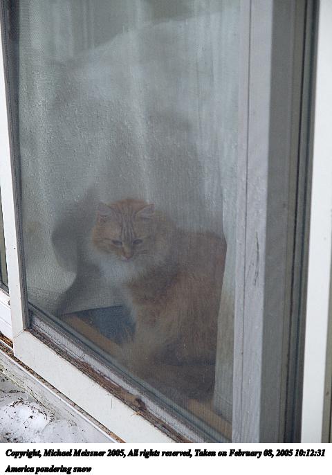 Picture #2: America pondering snow 480x686, 51,300 bytes (51K), (html file) Copyright, Michael Meissner 2005, All rights reserved Olympus E-1 camera with Olympus 14-54mm f/2.8-3.5 lens f/3.5, ISO 100, 1/100 sec, 54.0mm, auto mode, SHQ, matrix metering, -2 contrast, +2 sharpening 35mm equivalent focal length 108.0mm Taken by Michael Meissner on February 08, 2005 10:12:31 Last modified on February 08, 2005 at 10:43 |
