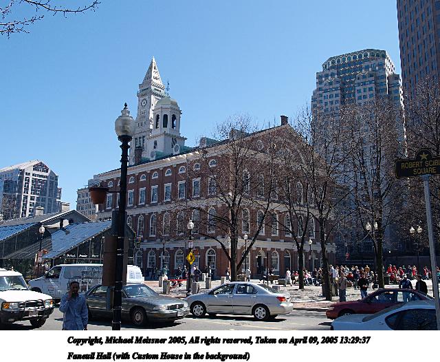 Picture #88: Faneuil Hall (with Custom House in the background) 640x526, 99,805 bytes (98K), (html file) Copyright, Michael Meissner 2005, All rights reserved Olympus E-1 camera with Olympus 14-54mm f/2.8-3.5 lens f/6.3, ISO 100, 1/200 sec, 19.0mm, auto mode, SHQ, matrix metering, -2 contrast, +2 sharpening 35mm equivalent focal length 38.0mm Taken by Michael Meissner on April 09, 2005 13:29:37 Last modified on April 10, 2005 at 09:14 |